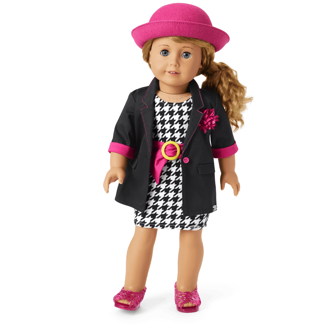 Courtney’s™ Awesome Accessories: A pink porkpie-style hat, a pink belt with a yellow buckle, and a pair of pink jelly shoes