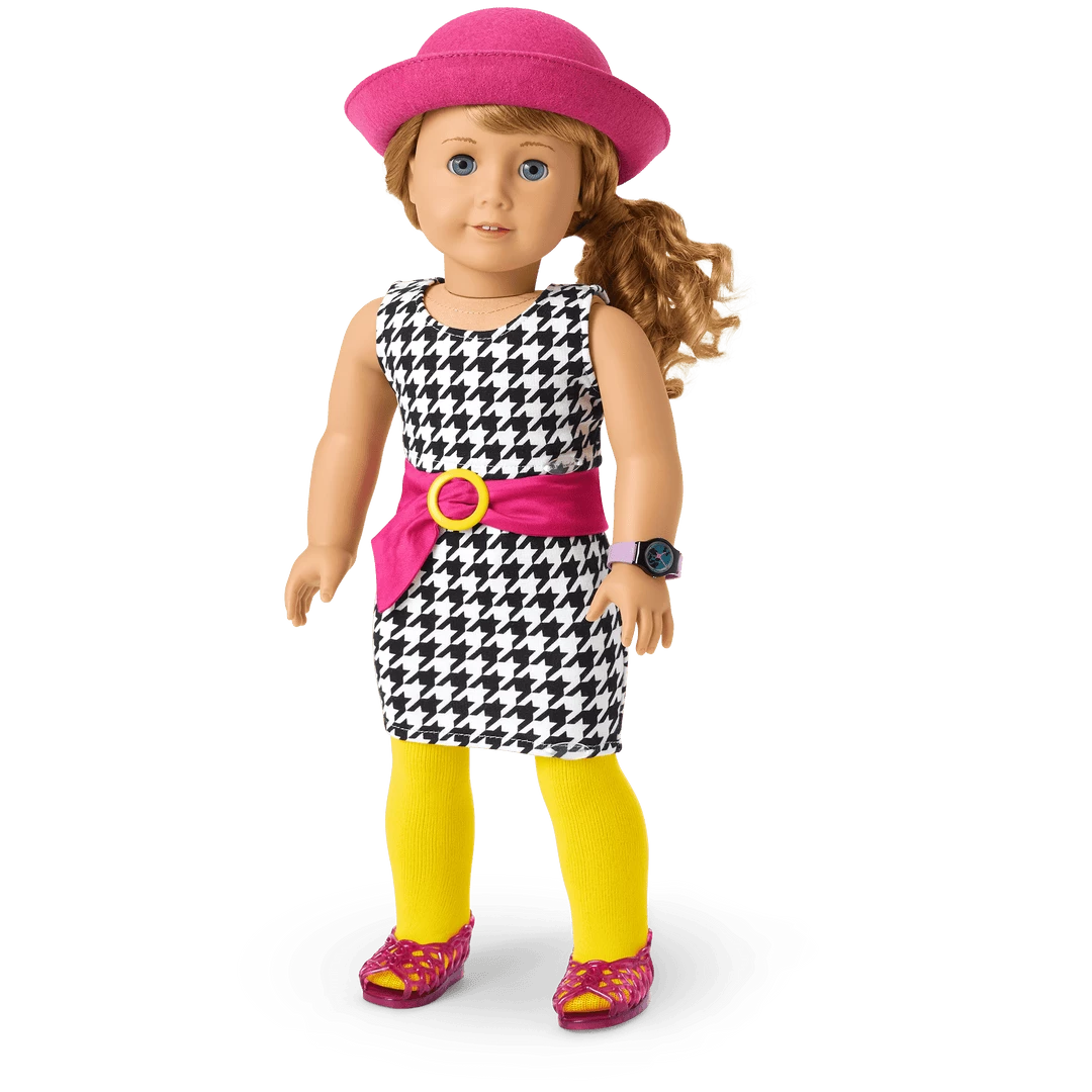Courtney’s™ Awesome Accessories: A pink porkpie-style hat, a pink belt with a yellow buckle, and a pair of pink jelly shoes