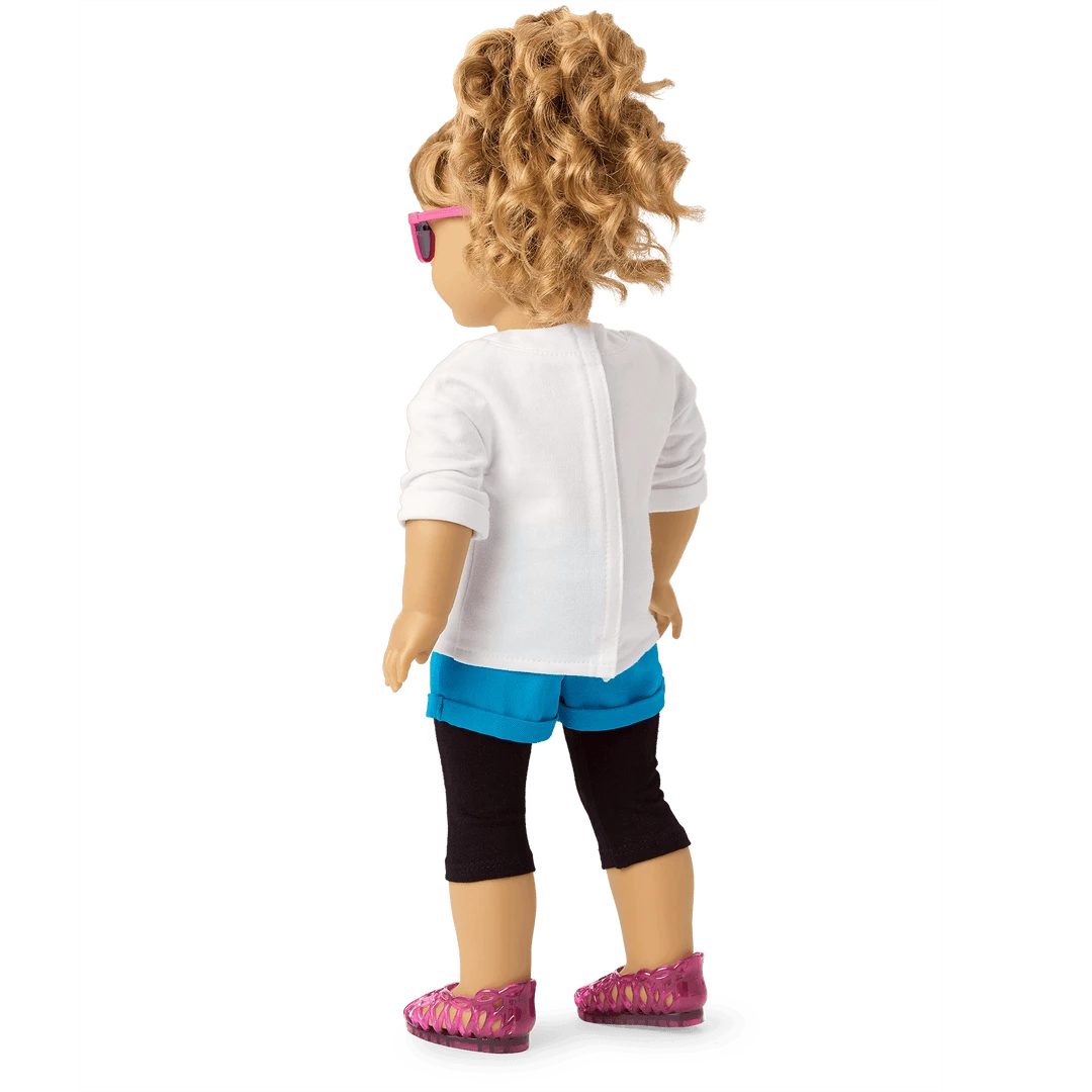 Courtney’s™ Awesome Accessories: A pink porkpie-style hat, a pink belt with a yellow buckle, and a pair of pink jelly shoes
