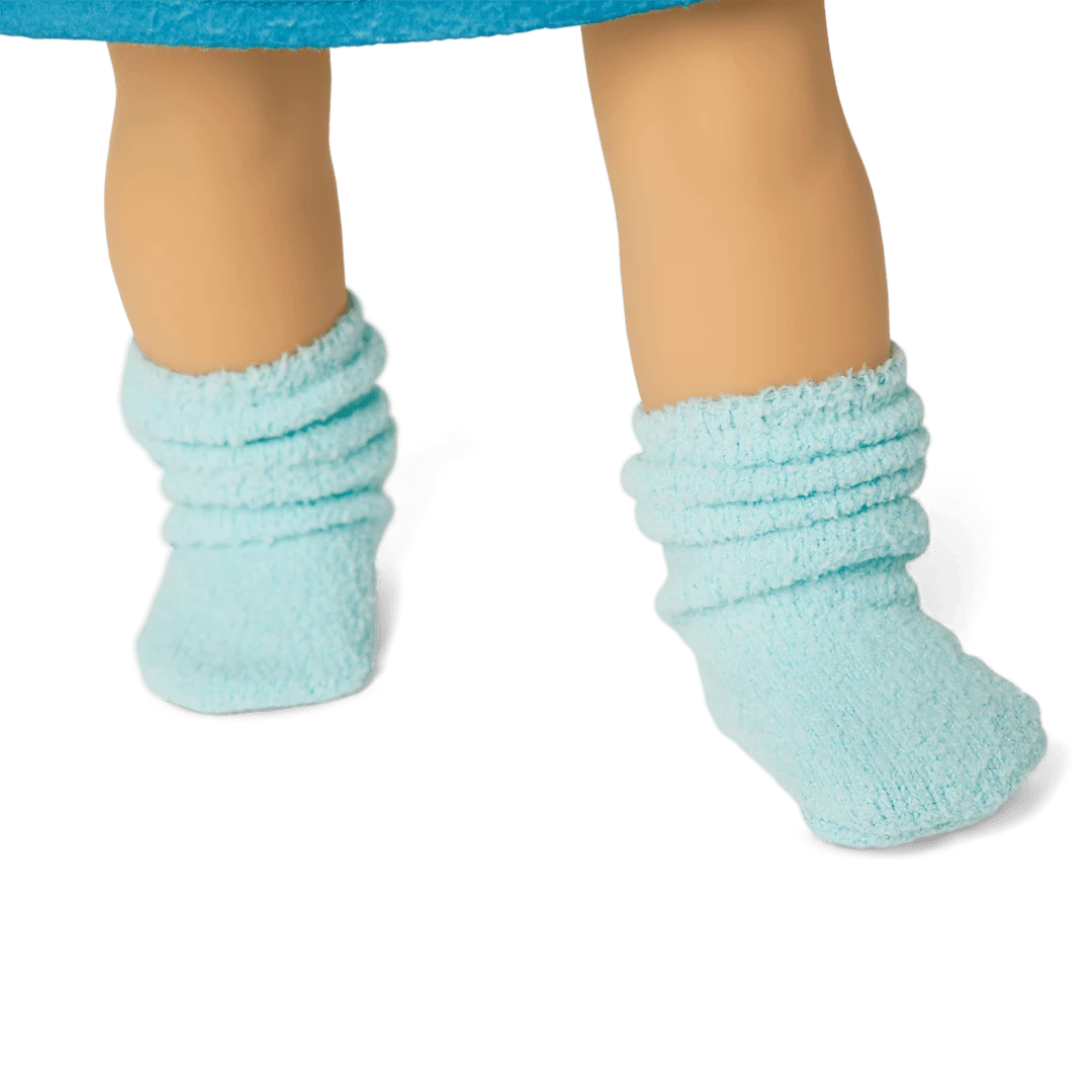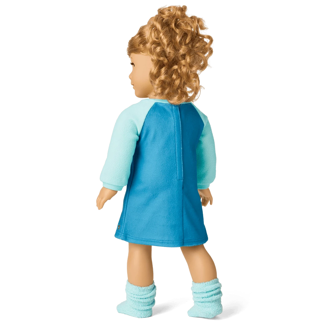Courtney loves stuffed animals, and Care Bears™ are her favorite. Her blue fleece night shirt with a 1980s Care Bears™ graphic on the front has lighter blue raglan contrast sleeves. Also includes a pair of light blue fuzzy socks and a matching hair tie.