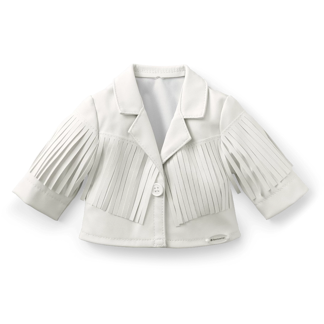 Courtney’s™ White Fringe Jacket: A white faux-leather jacket with fringe