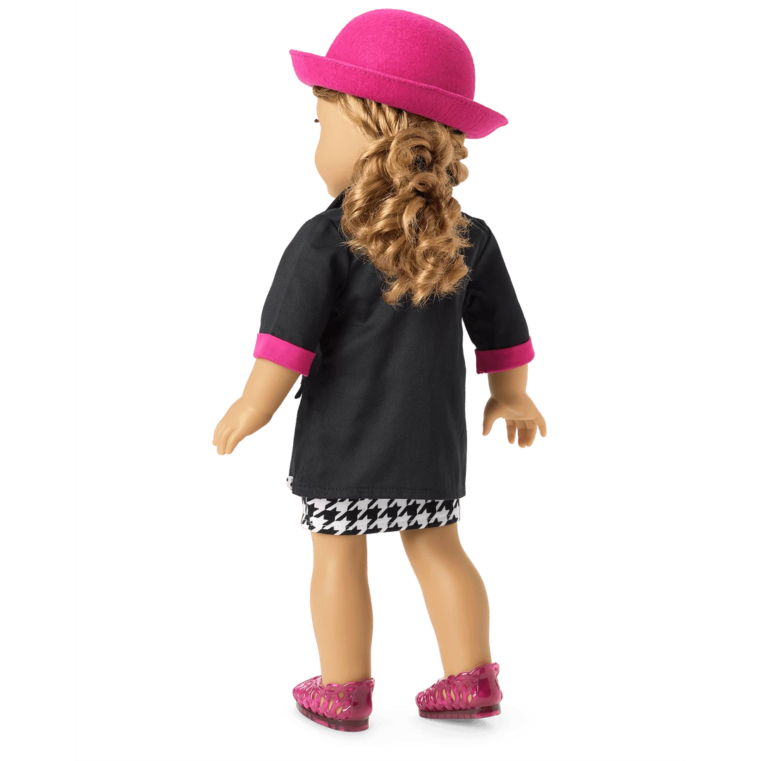 Courtney’s™ Awesome Accessories: A pink porkpie-style hat, a pink belt with a yellow buckle, and a pair of pink jelly shoes