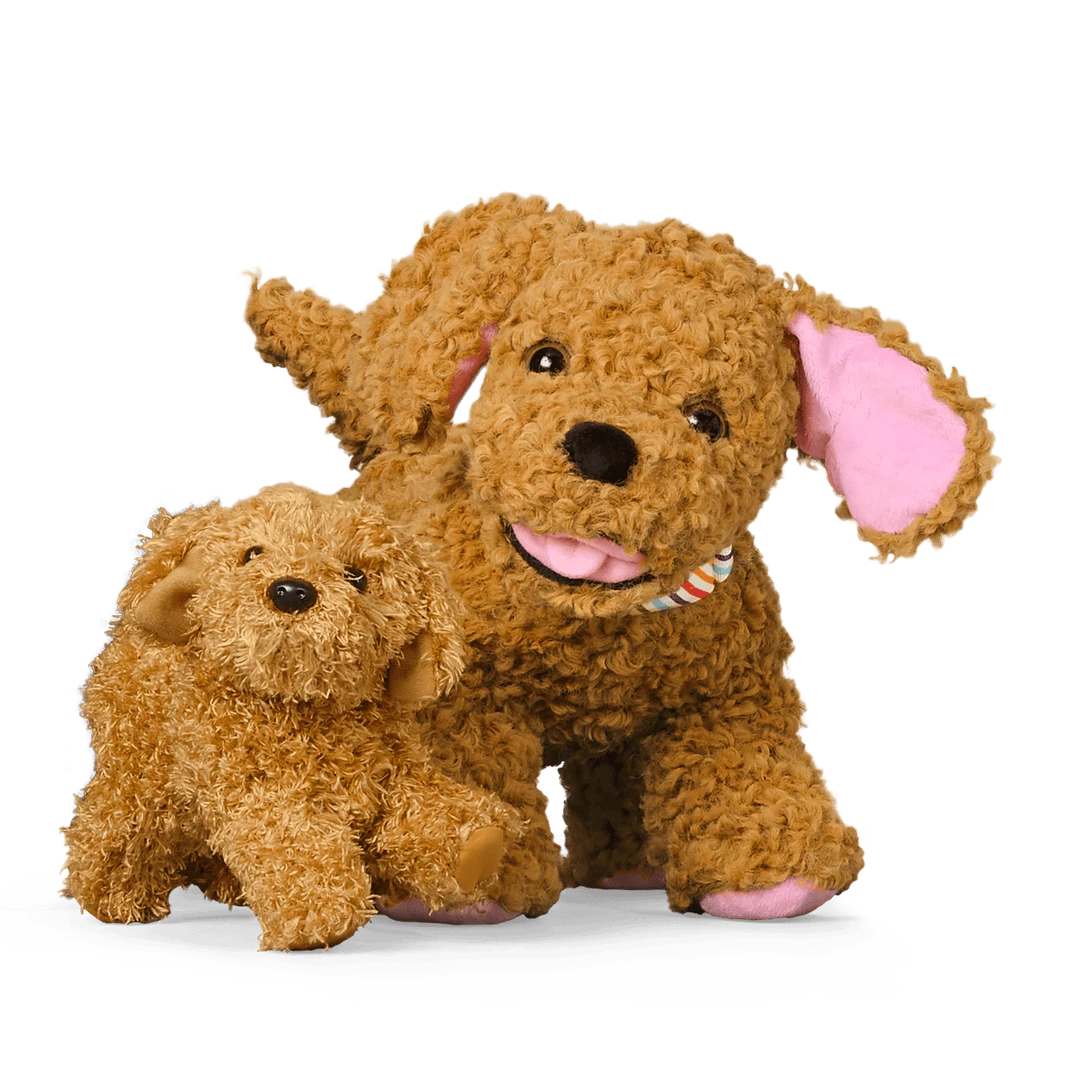 Daffodil Doodle™ Dog for 18-inch Dolls: This posable Labradoodle dog has short, curly golden-brown fur, brown eyes, and a magnetic mouth to hold her barbell toy. Plus, her box can be transformed into a pet house!