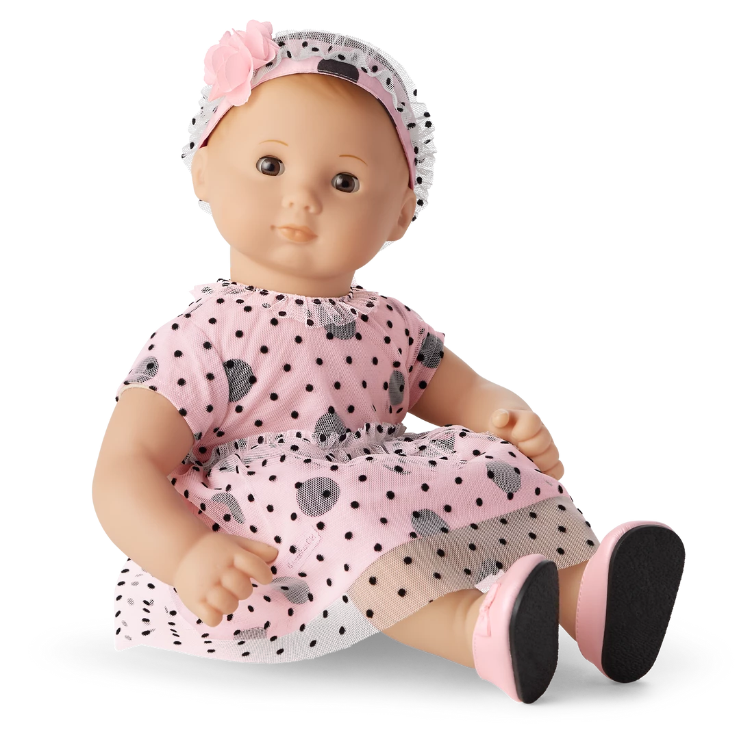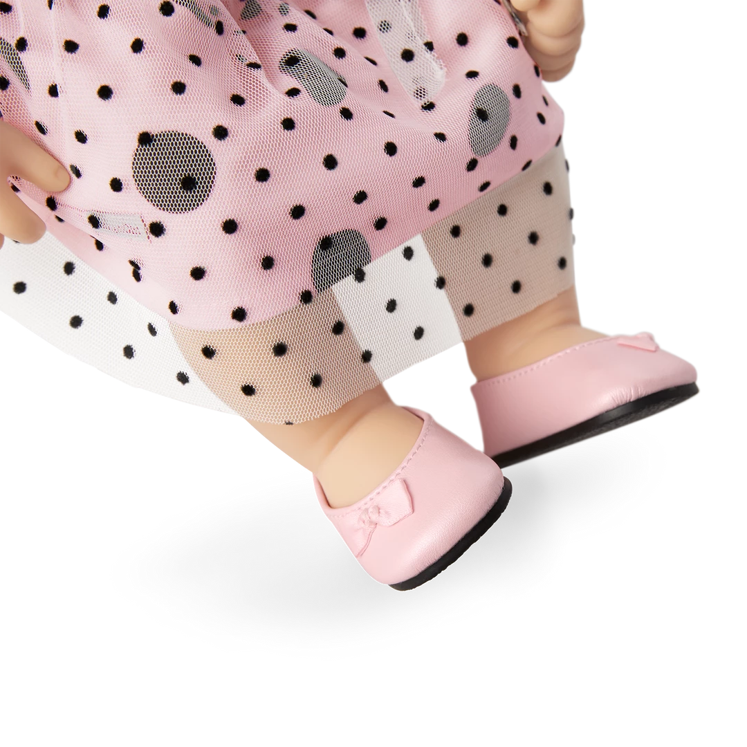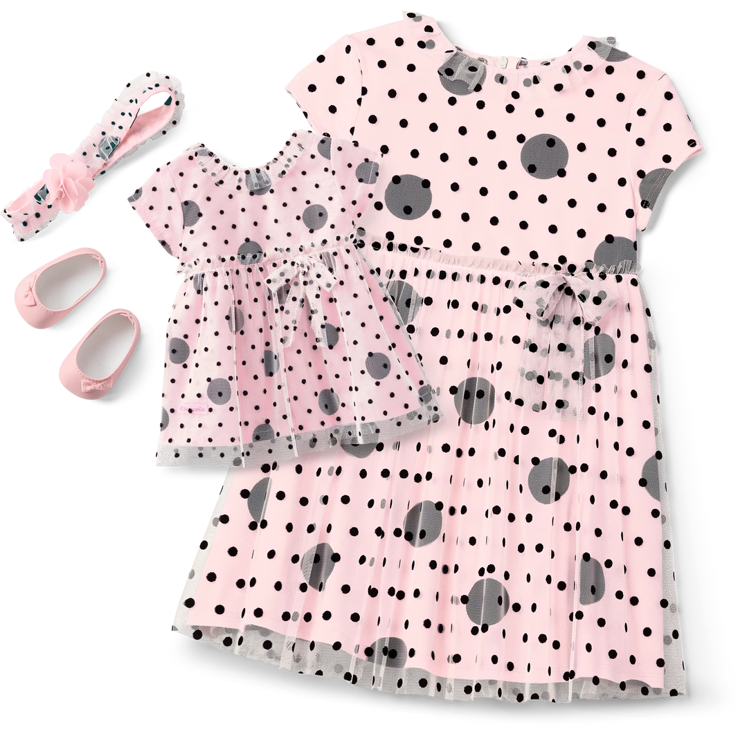 Little girls and their Bitty Baby dolls can twirl into spring in pretty matching dresses! These pale-pink dresses have black polka dots and an overlay of pink mesh with smaller flocked black dots. Bitty Baby’s dress includes shoes and a headband. Girls’ dress: Polyester/cotton/spandex. Imported. Pink. Sizes 2-6
