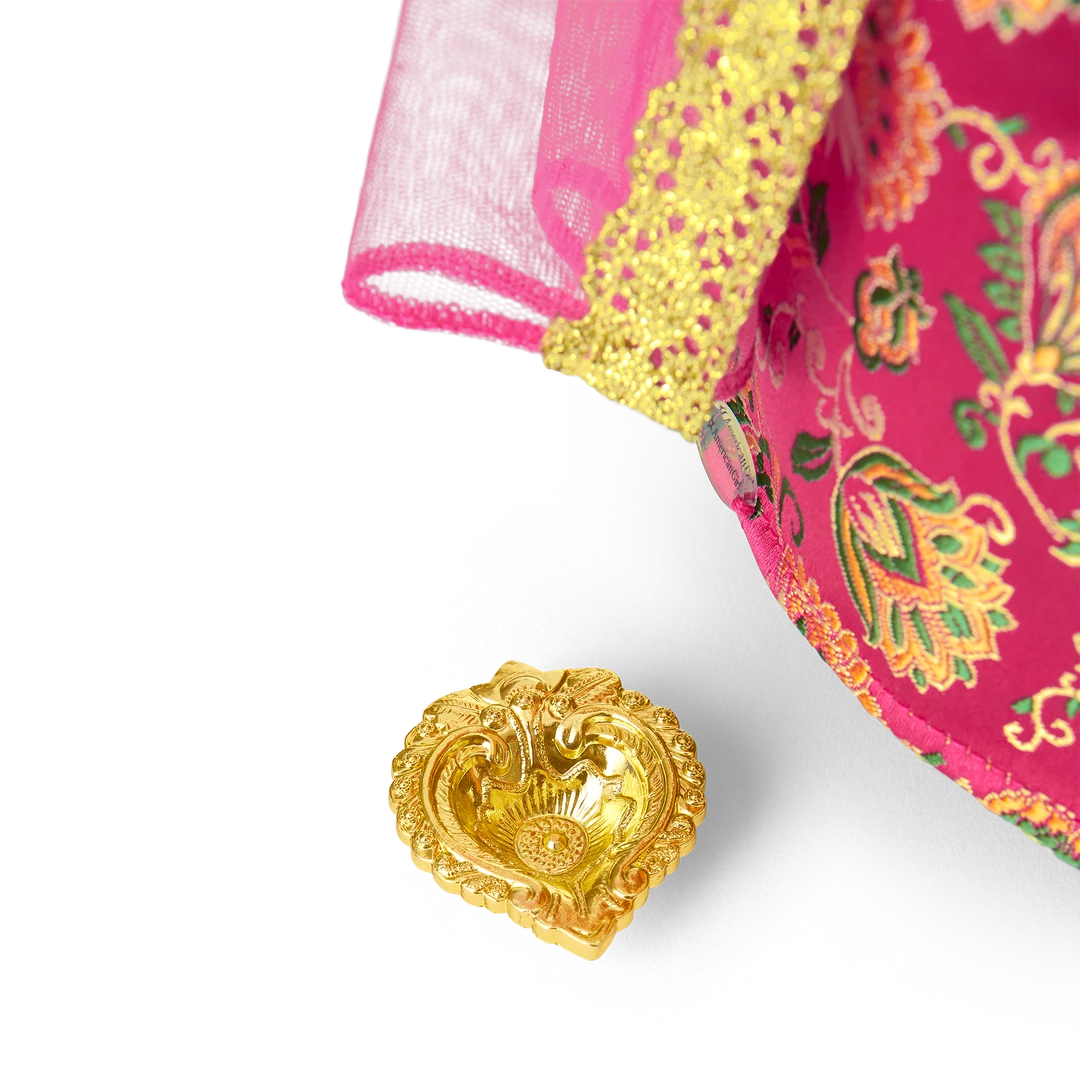 - A bright pink mesh dupatta, or shawl, with embroidered gold trim on one edge