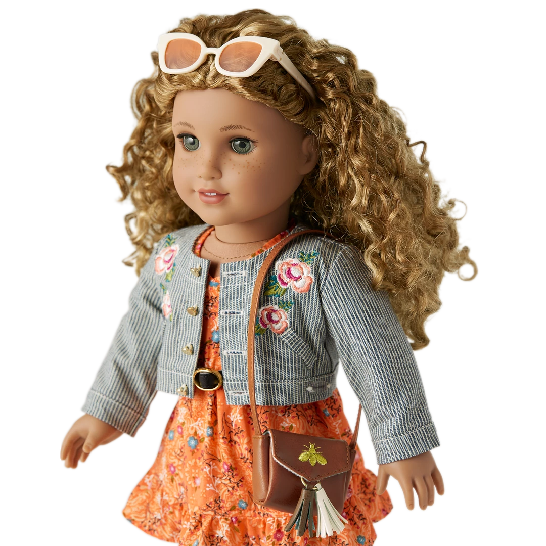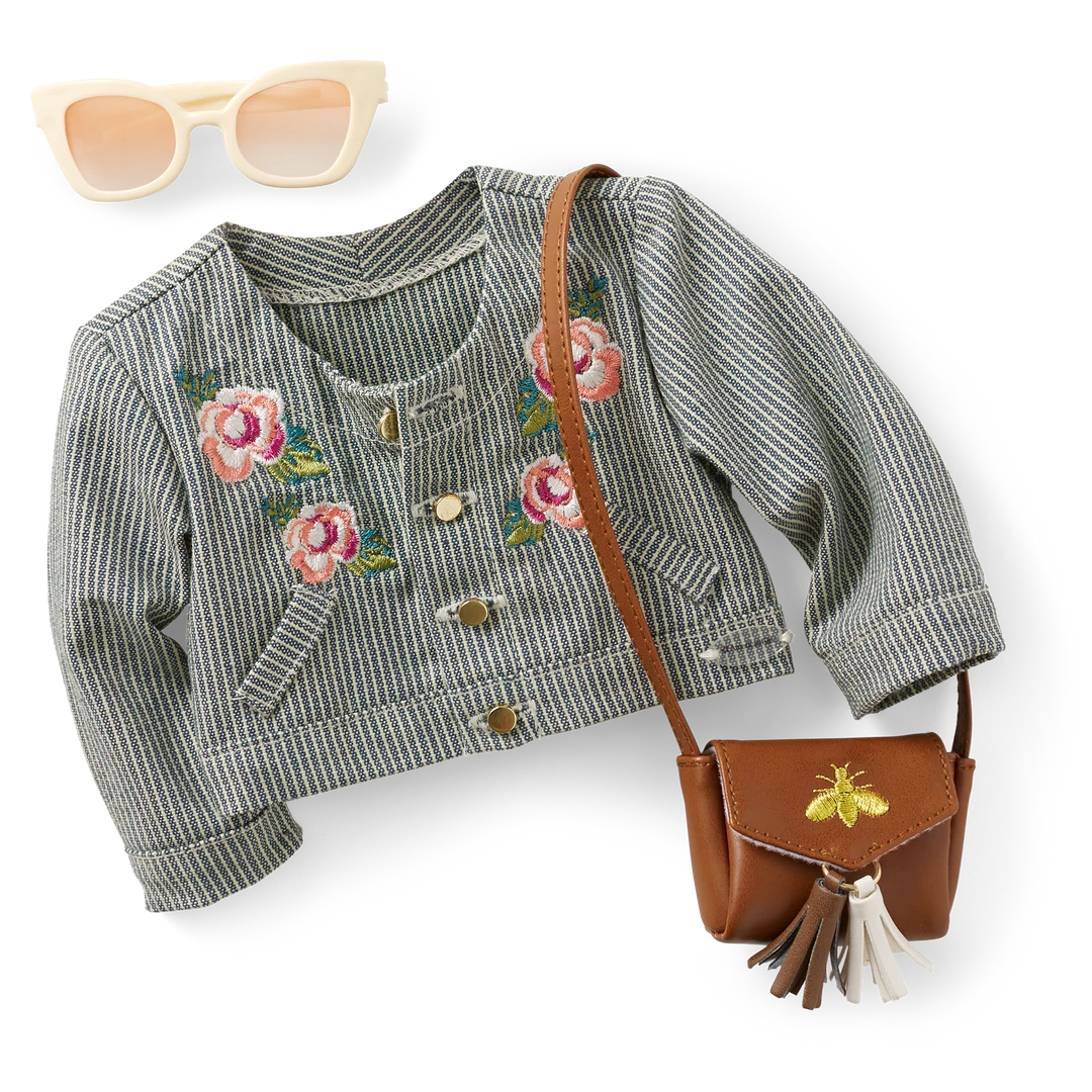 - A collarless cropped striped denim jacket with floral embroidery on the front