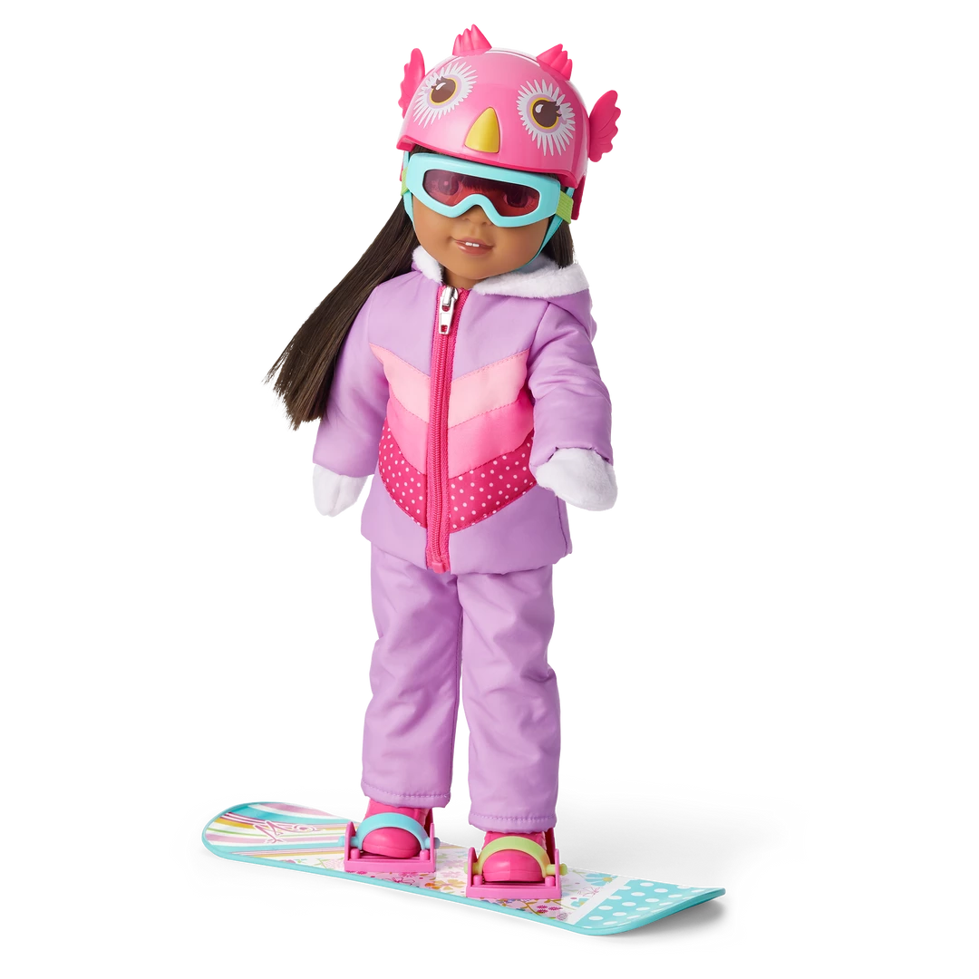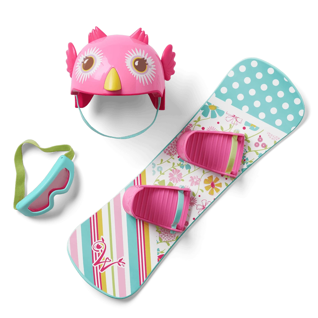Frosty Fun Snowboard Set for WellieWishers™ Dolls: A colorful mixed-print snowboard with movable straps to buckle in her boots, plus a helmet and goggles