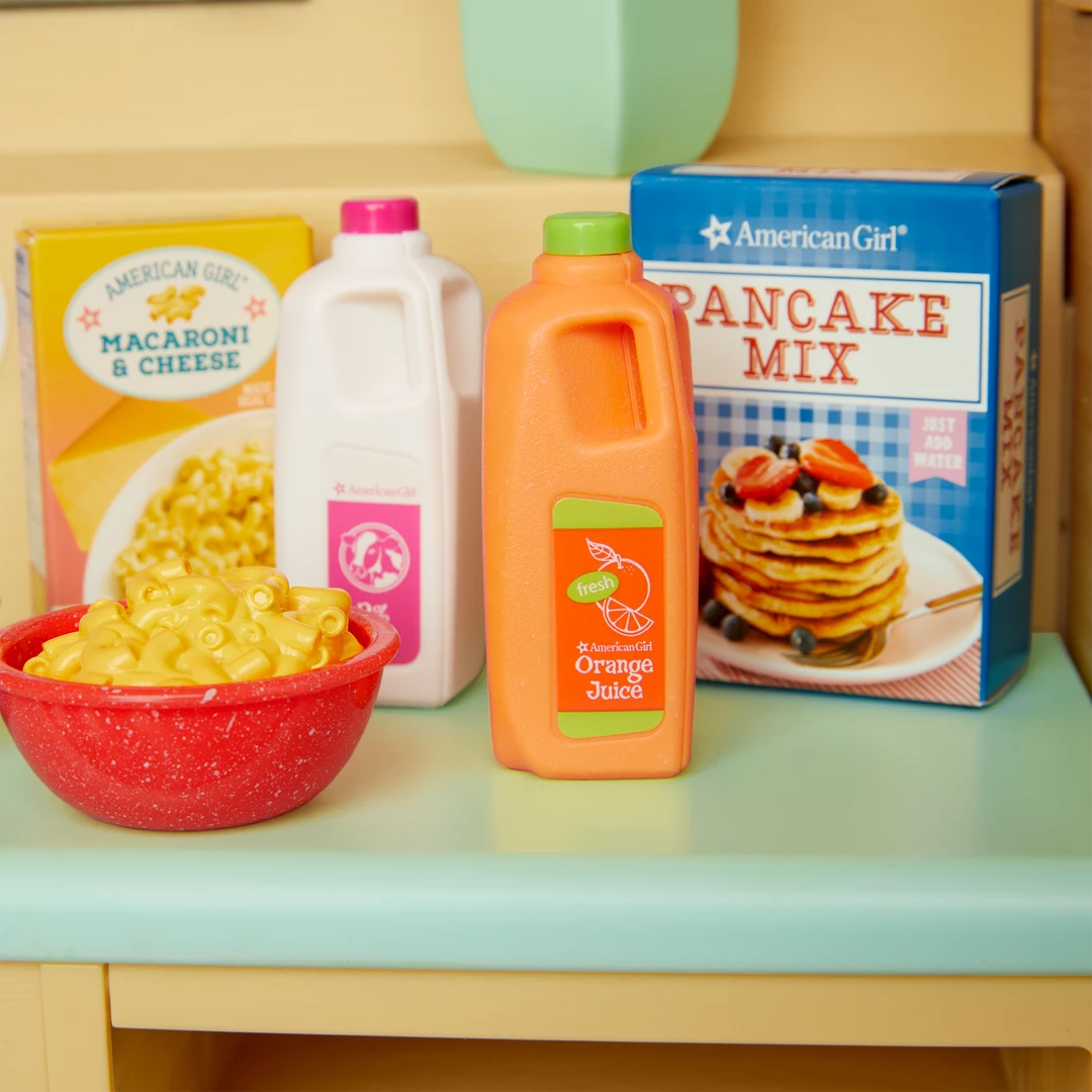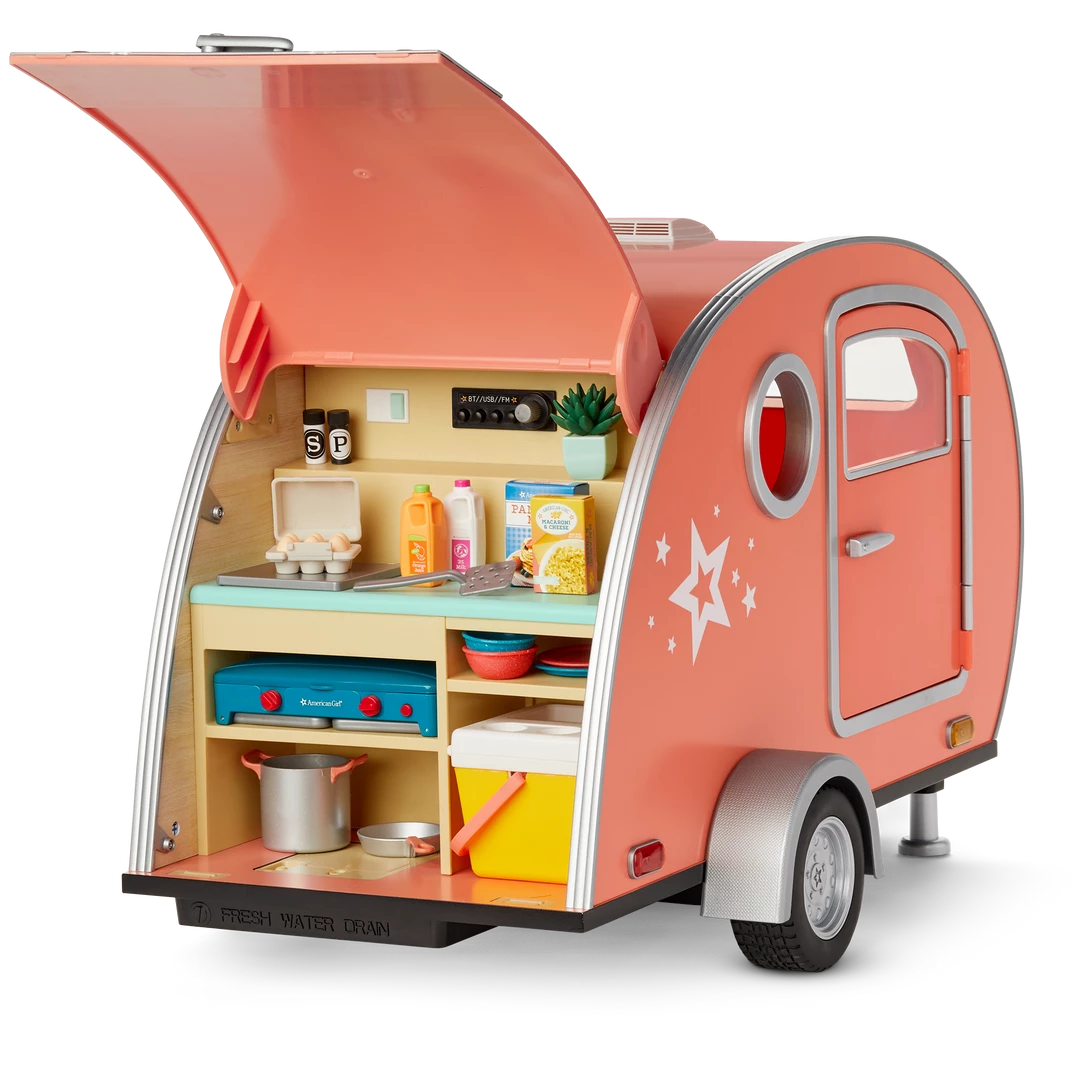 It’s a great adventure to explore the great outdoors in a comfy camper. This teardrop-shaped camper has a main cabin with a skylight, a flip-down table, and a couch that converts to a bed that fits two dolls. The kitchen area in the back has a countertop, flip-down sink, and shelves to store all the food. There are two working lights inside for nighttime and an adjustable speaker that plays three songs and two nature sounds. The set also includes:
