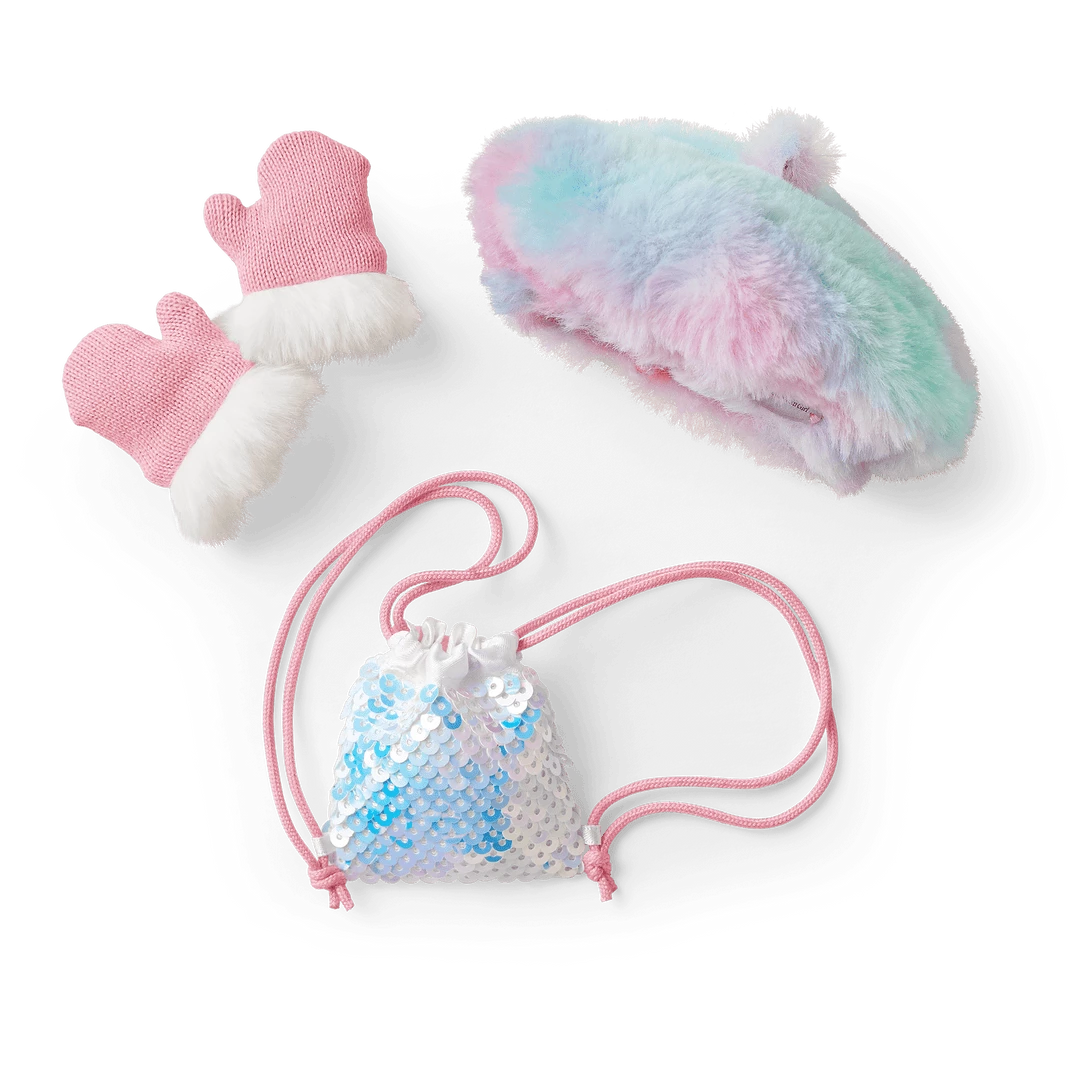 Gwynn’s™ Accessories: A faux-fur beret, knit mittens with furry trim, and a sequined backpack