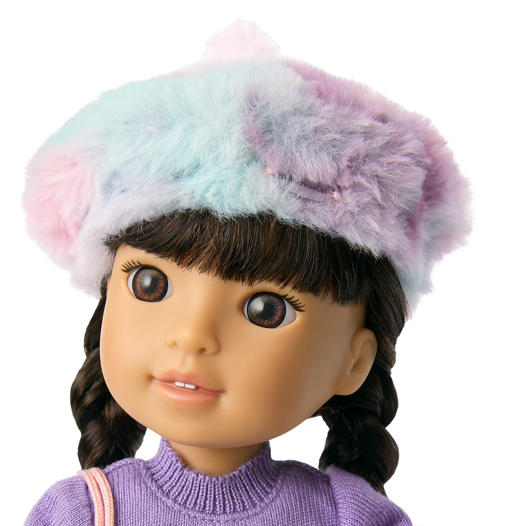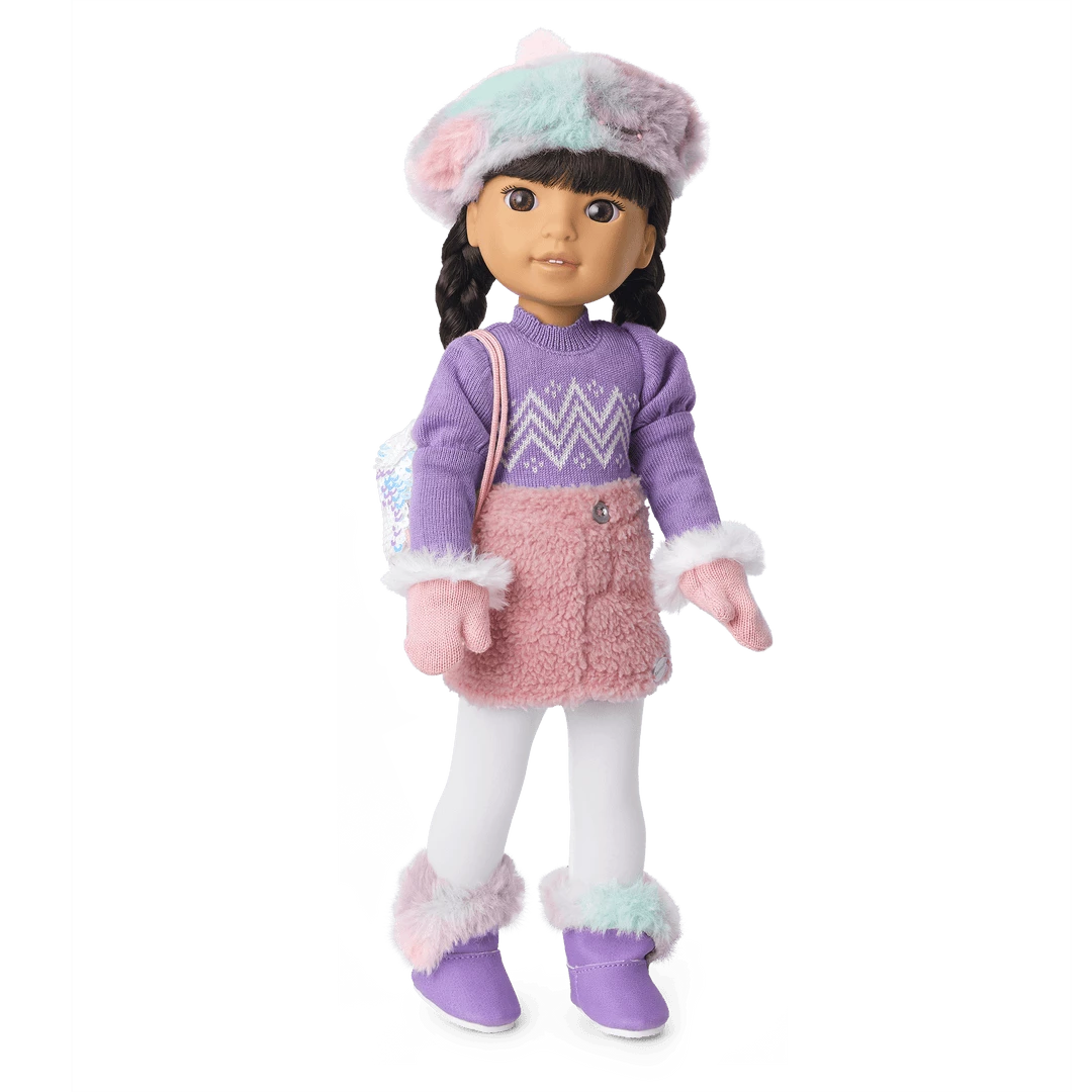 Gwynn™ Doll: The 14.5″ Gwynn™ doll has brown eyes and long, braided black hair with bangs. Gwynn arrives wearing a purple knit sweater, a faux-fur skirt, white leggings, underwear, and purple boots with faux-fur trim.