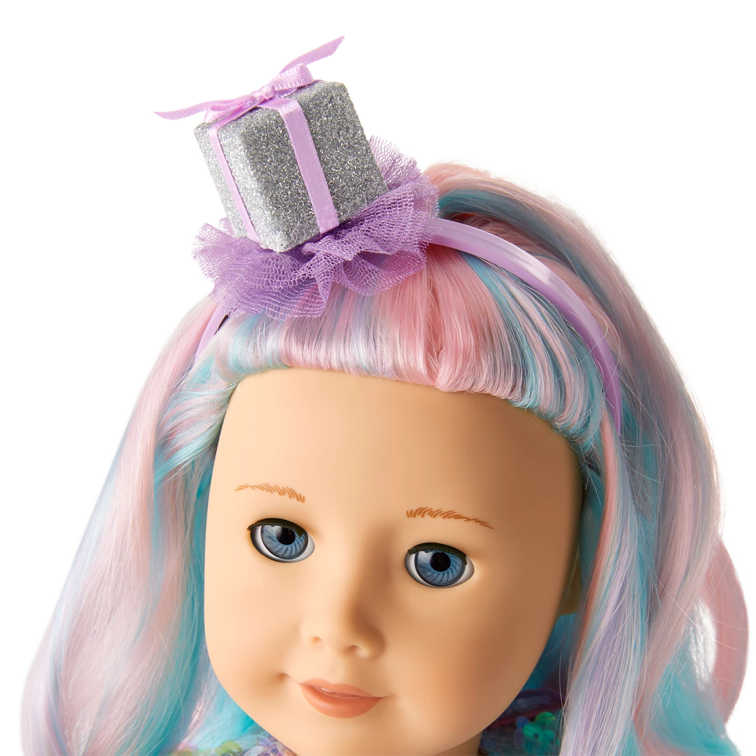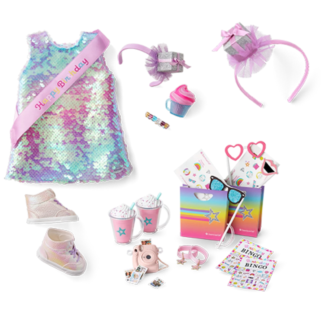 American Girl® Take the Cake Birthday Outfit for 18-inch Dolls: An iridescent sequin mini dress, a purple headband featuring a small gift on top of a tulle pouf, a satin birthday sash, a bracelet, a pair of sneakers, and a faux cupcake the doll can hold