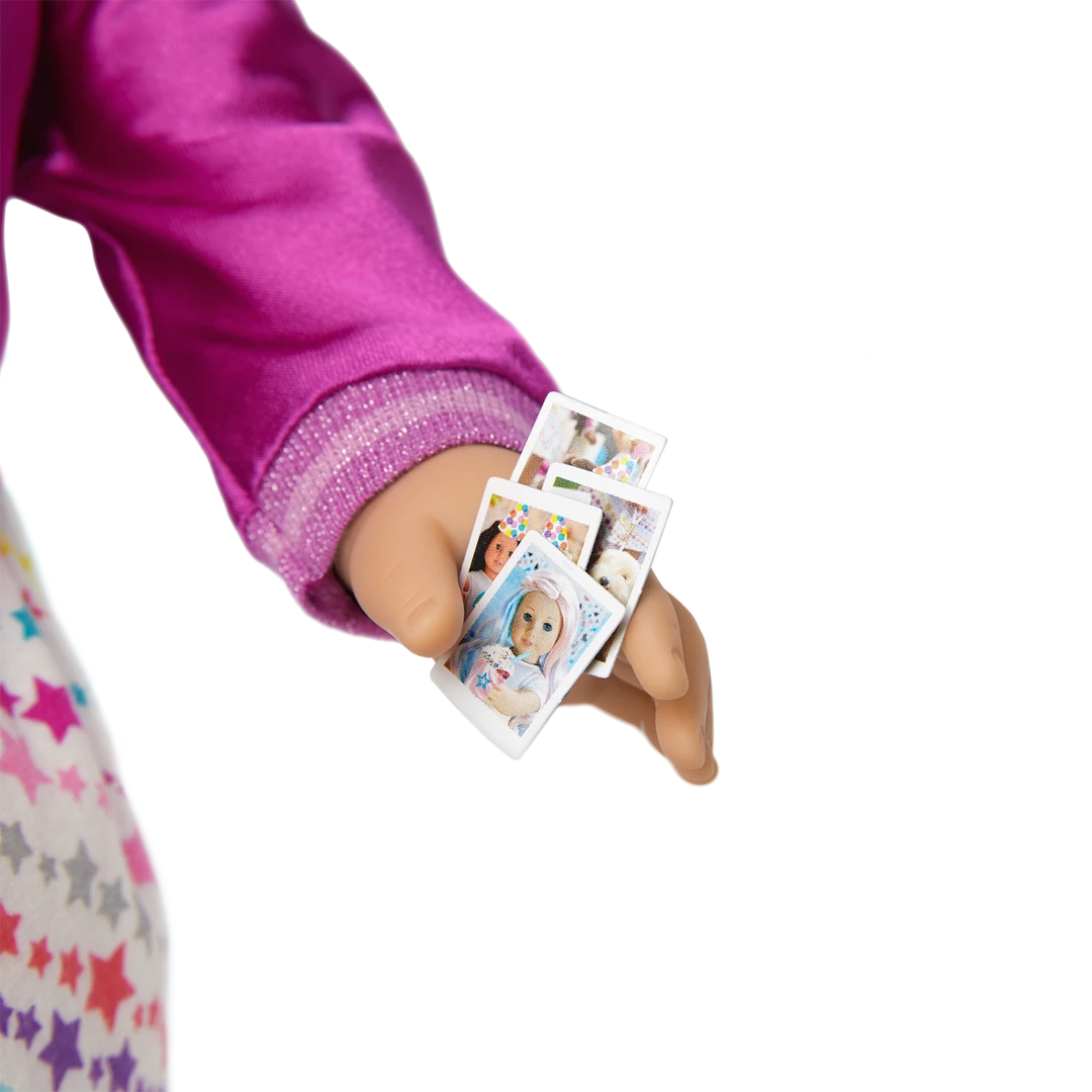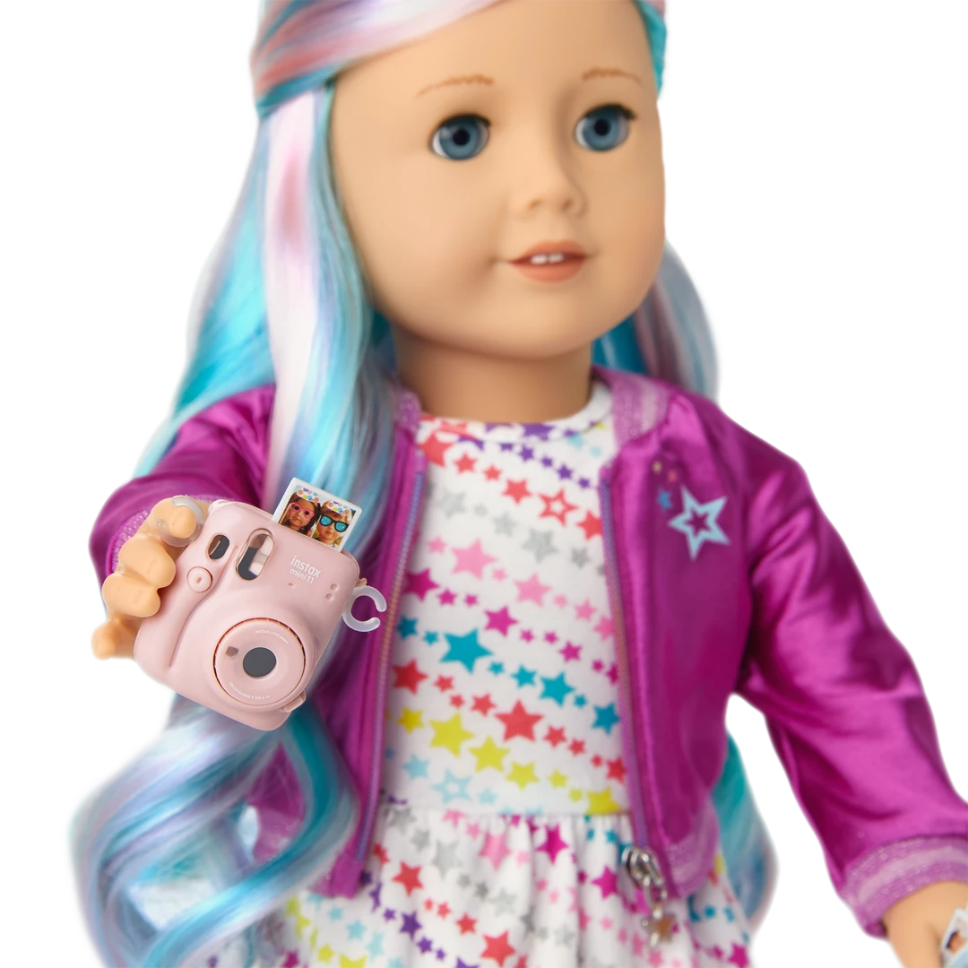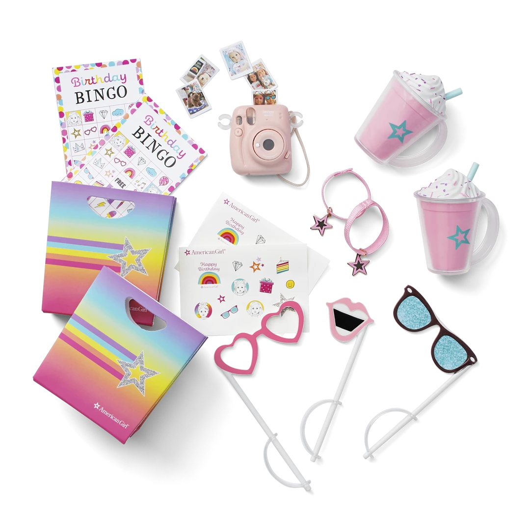 American Girl® Fun & Games Birthday Party Accessories: A doll-sized pretend FUJIFILM INSTAX™ Mini 11 instant camera, four INSTAX™ photos, photo props, two game cards, two doll bracelets, two sheets of stickers, two fancy faux beverages, and two goody bags