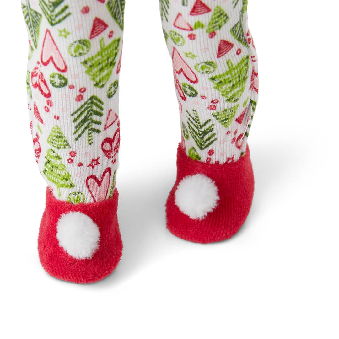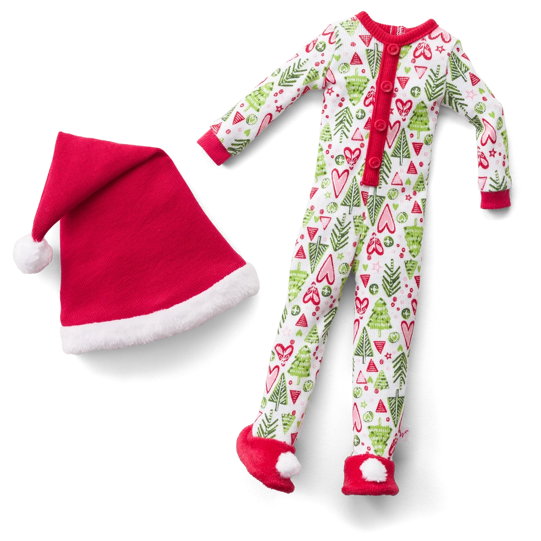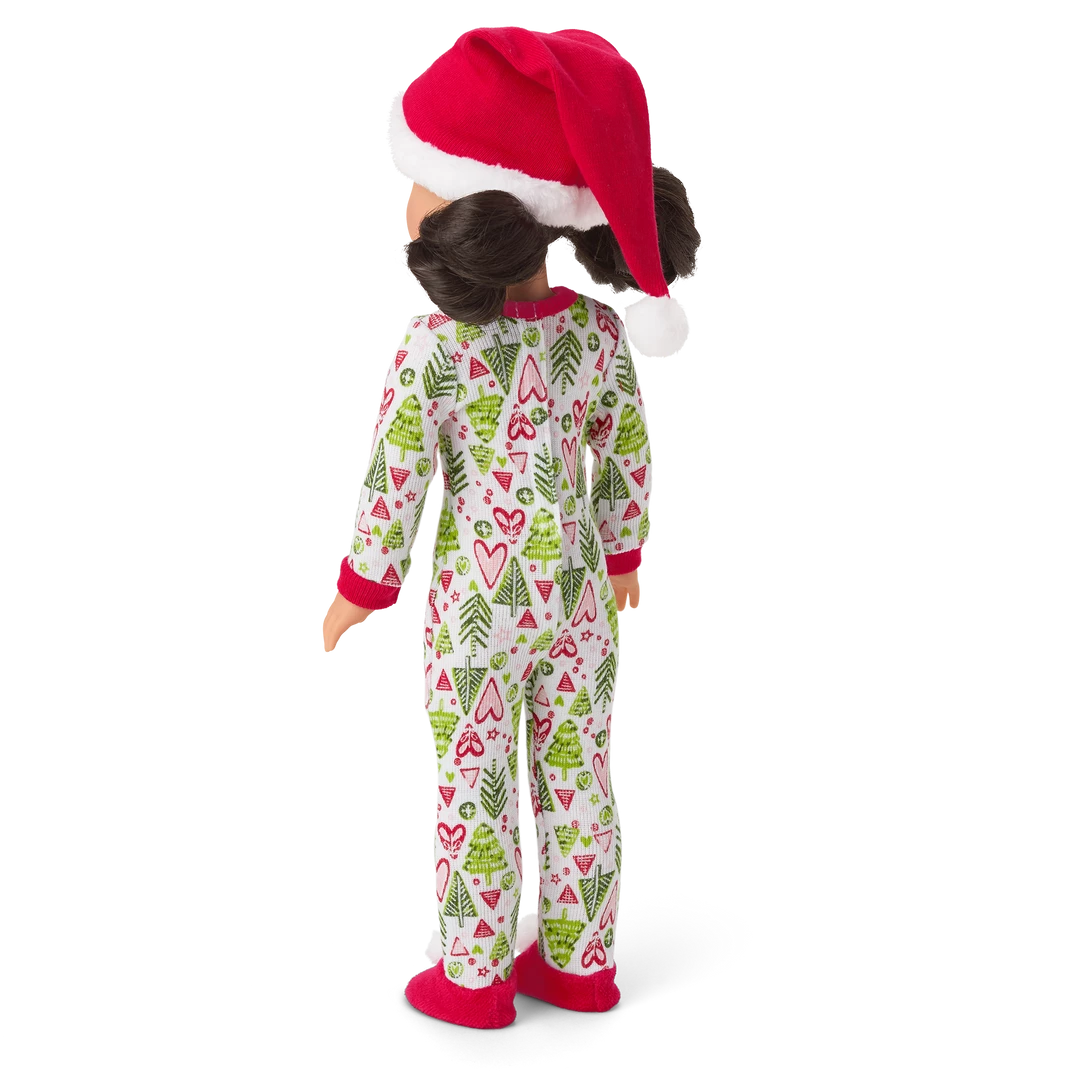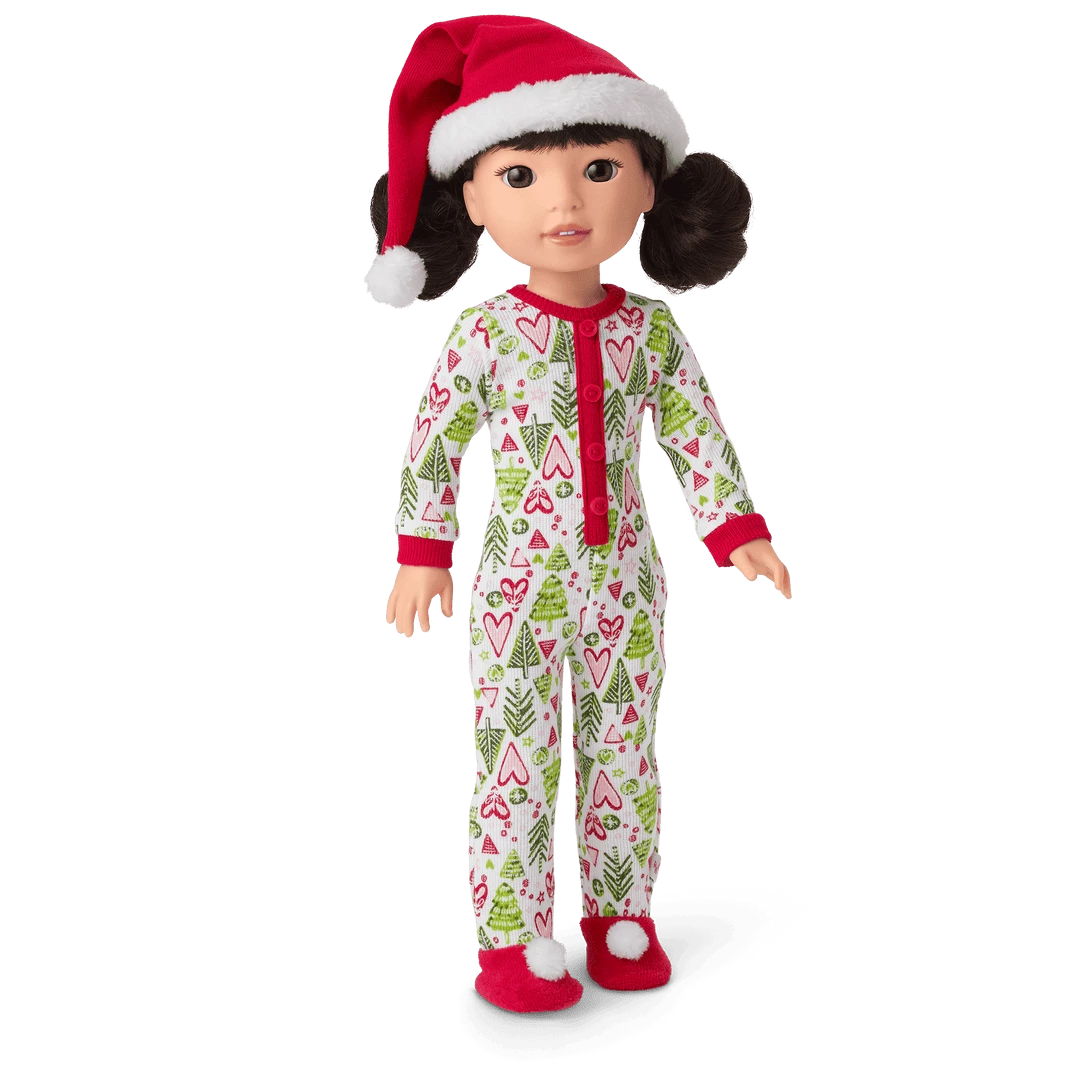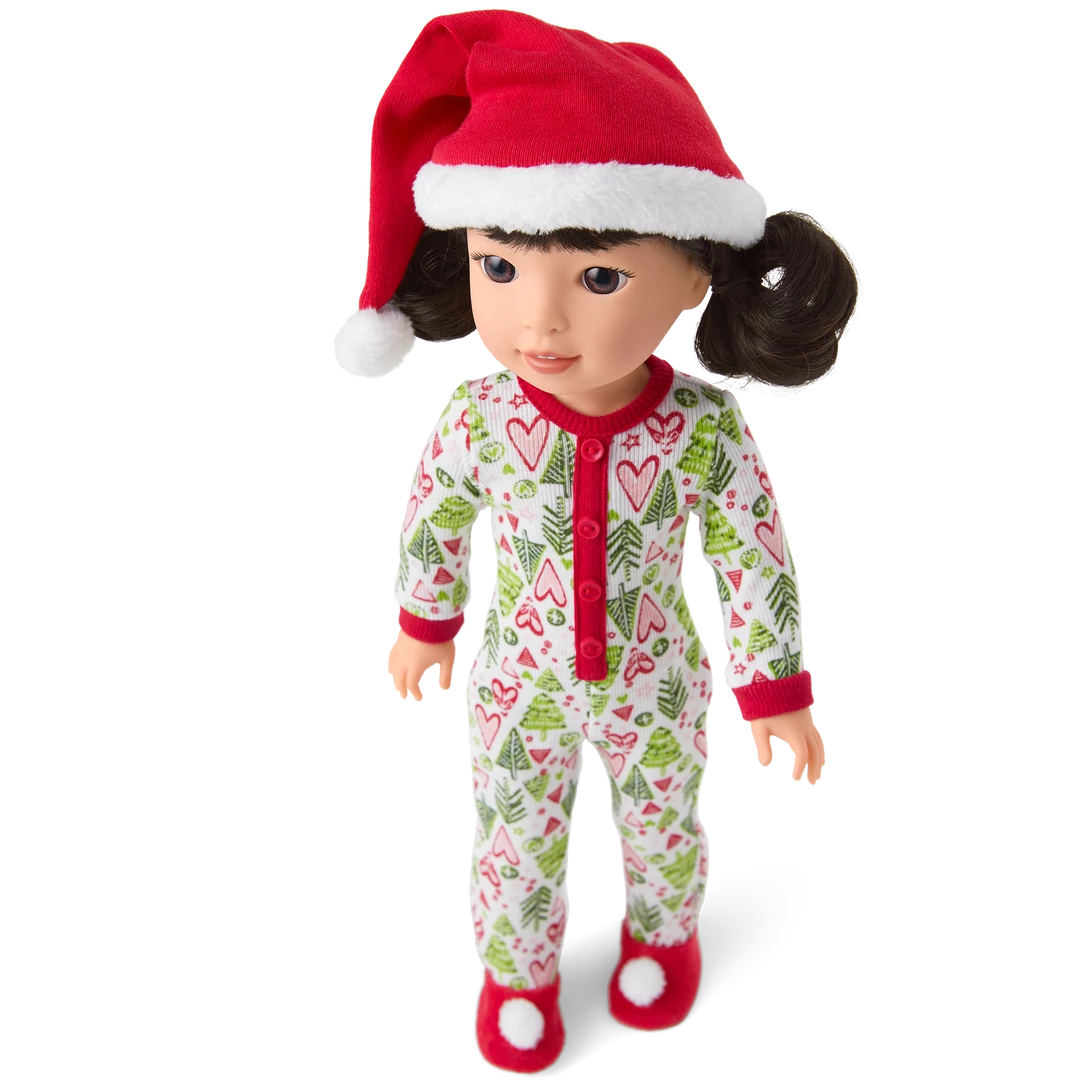 The WellieWishers can get cozy under the tree with hot cocoa in these holiday pajamas that feature a festive tree-and-heart-print unionsuit with contrasting red feet and cuffs. She’ll keep extra cozy—and festive—with a rib-knit Santa-style hat with faux-fur trim and a furry pom-pom.