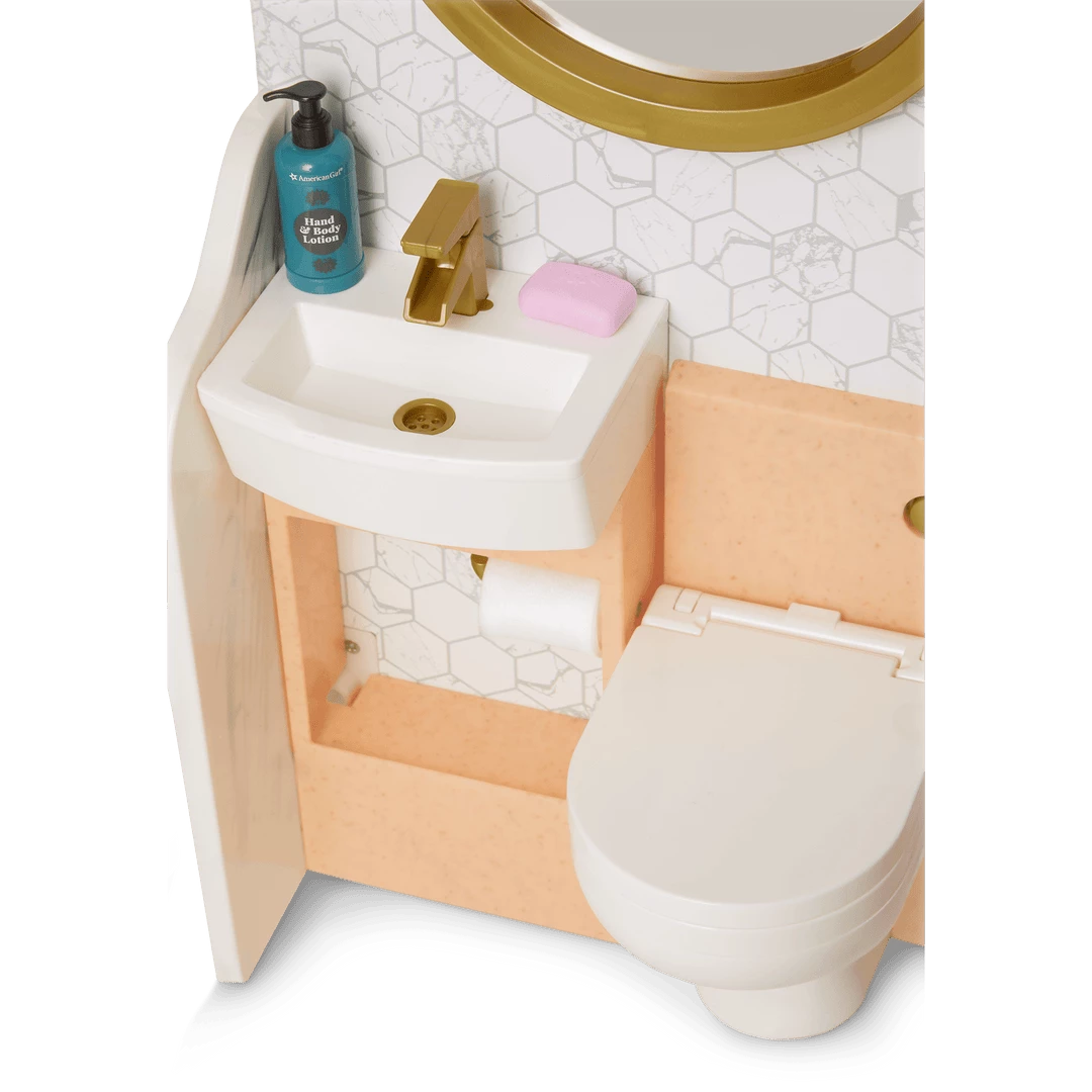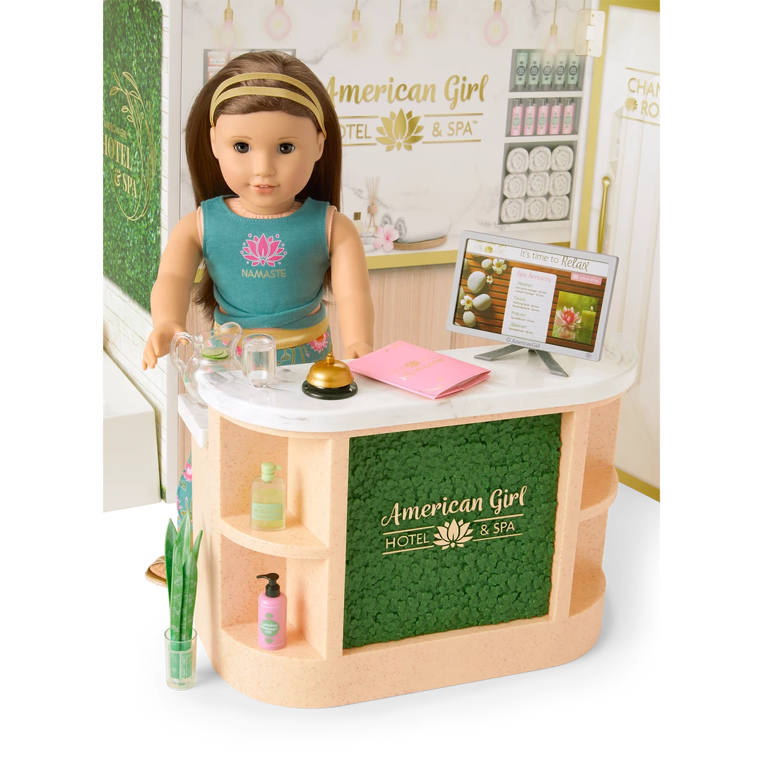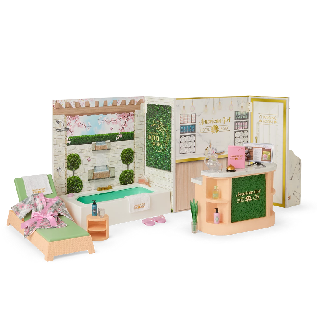 Check in and check out this luxurious hotel and spa! The large building structure has graphics on one side to look like a hotel room, including a printed window scene with curtains, and a bathroom with a mirror, sink, and toilet. The other side looks like a relaxing hotel spa, with printed walls depicting a tranquil outdoor setting, a soothing waterfall, and an indoor scene with a check-in area and a door to the changing room. The whole thing folds up for storage! The set also includes: