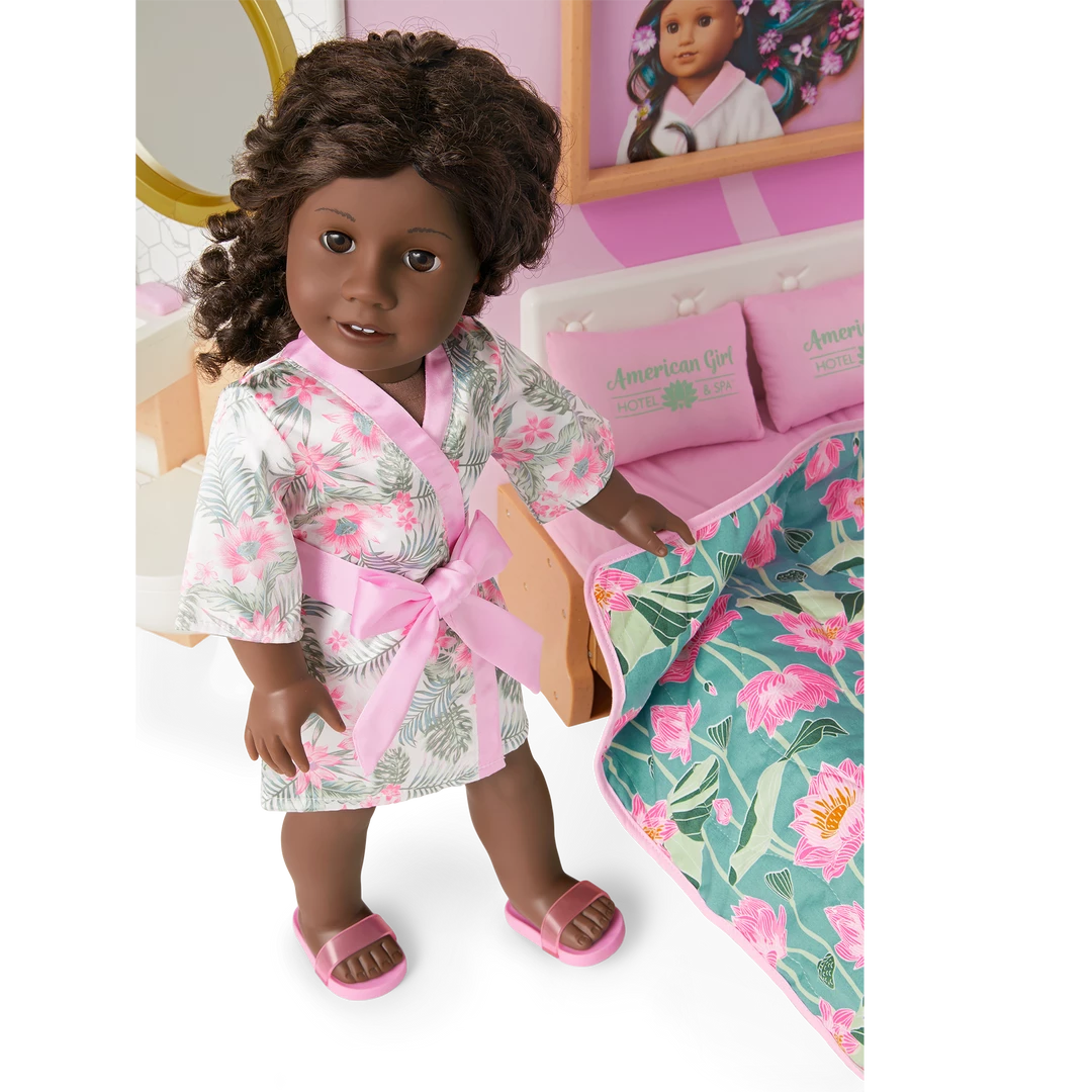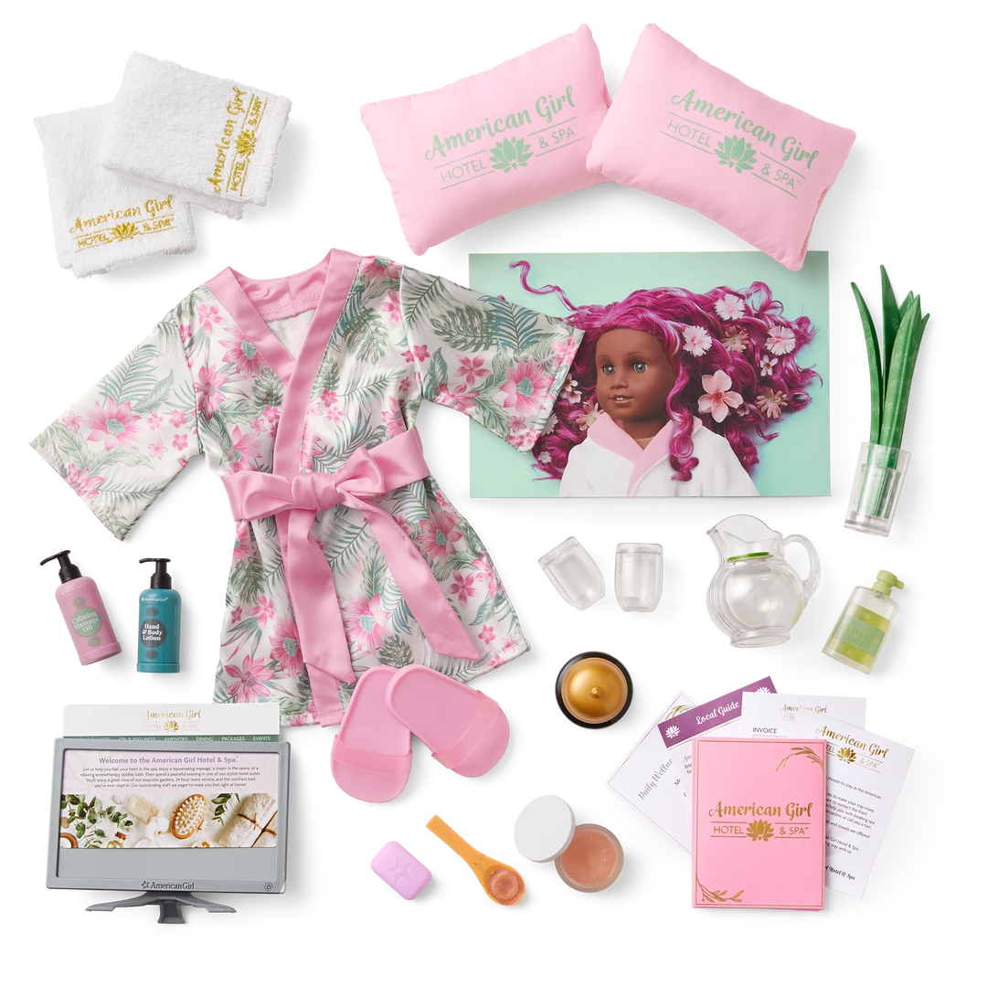 - Two pink pillows with the American Girl® Hotel & Spa logo printed in green