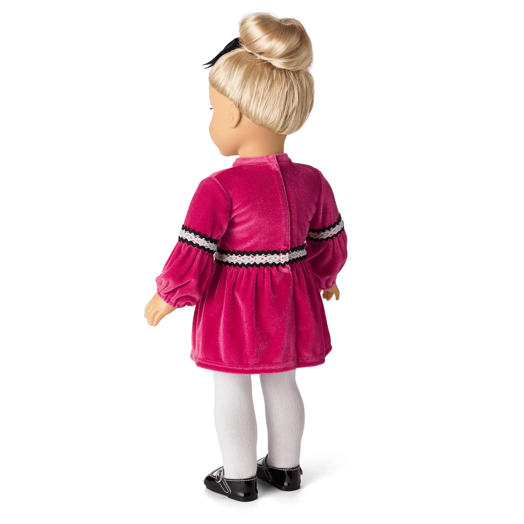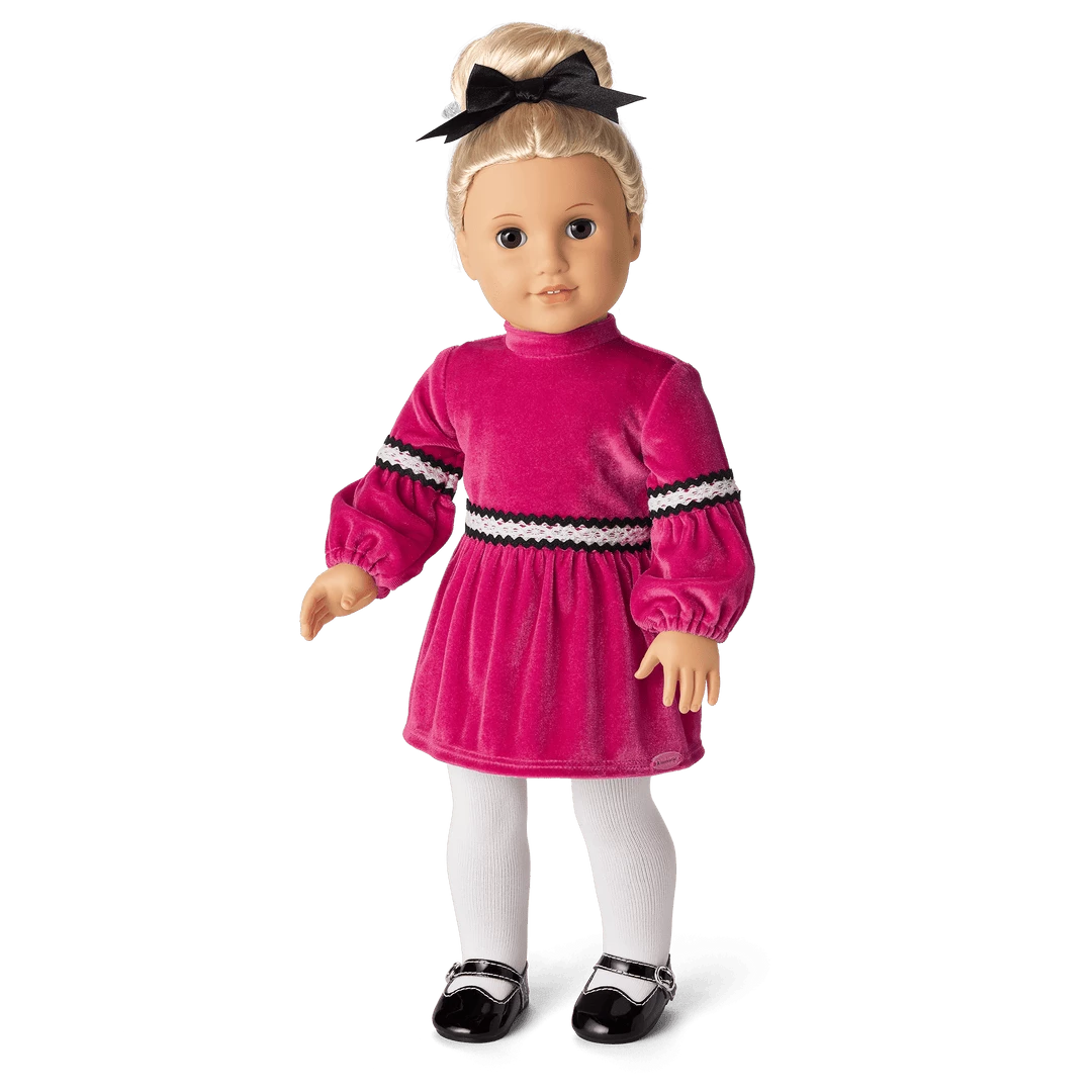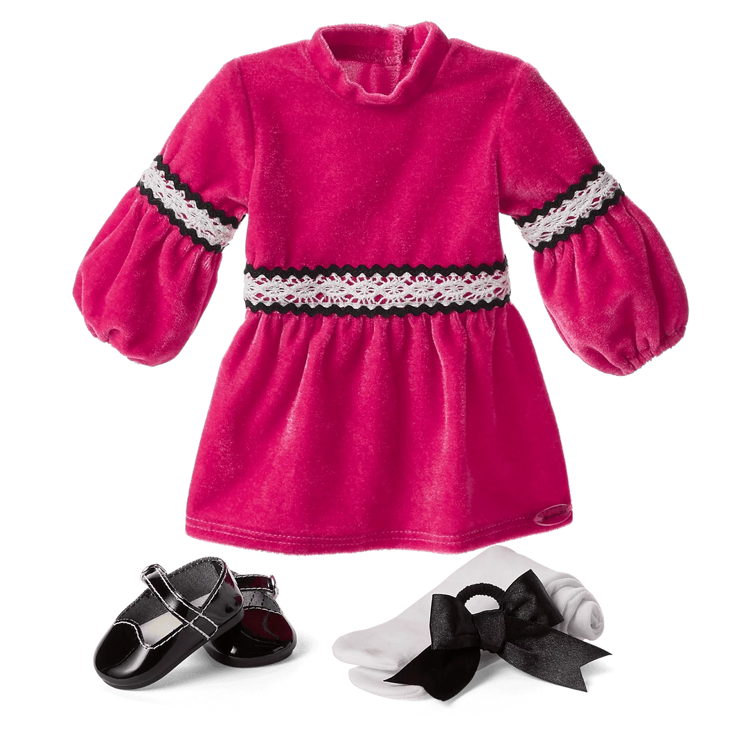 Julie’s™ Christmas Outfit for 18-inch Dolls: A ’70s-style velvet dress, a hairbow, tights, and Mary Jane shoes Julie’s™