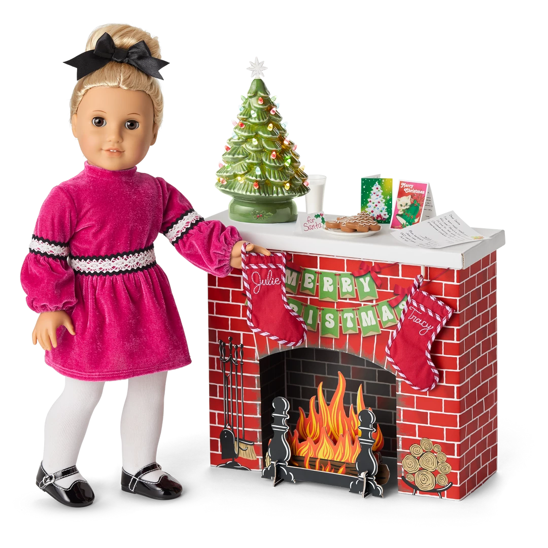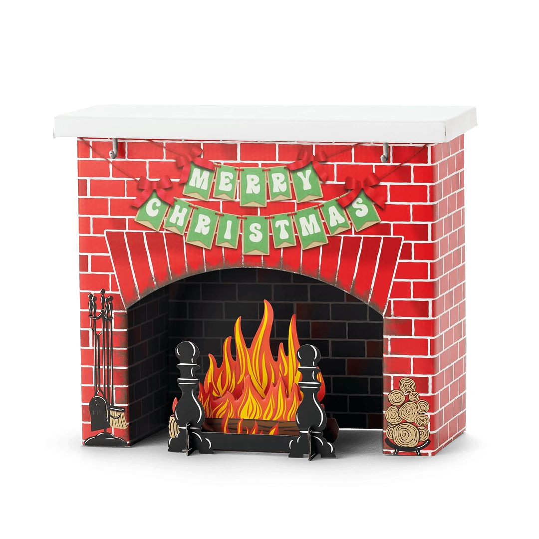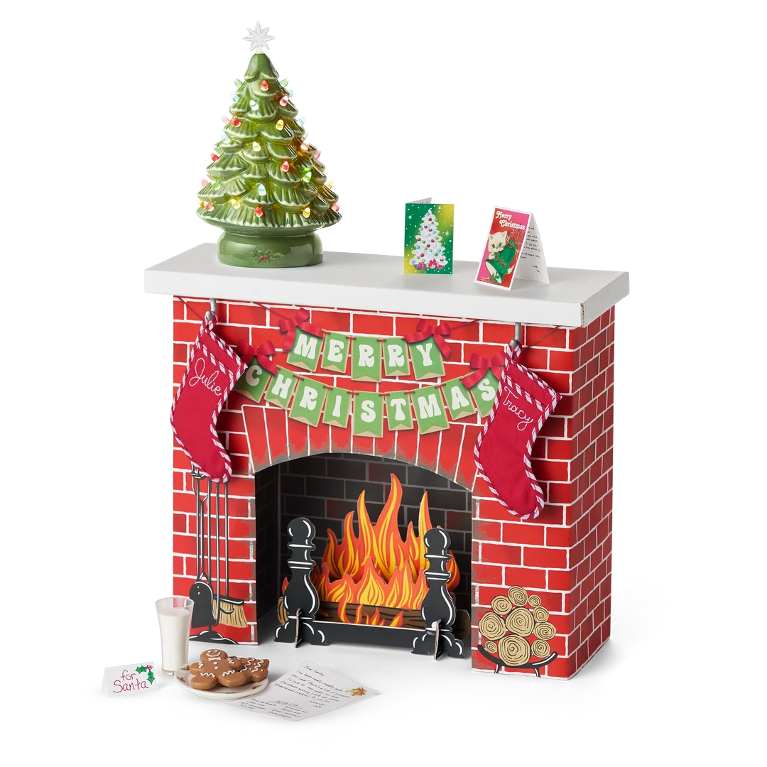 Julie’s™ Christmas Fireplace: A traditional cardboard fireplace, a light-up ceramic Christmas tree, stockings, treats for Santa, and Christmas cards.