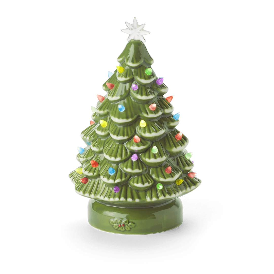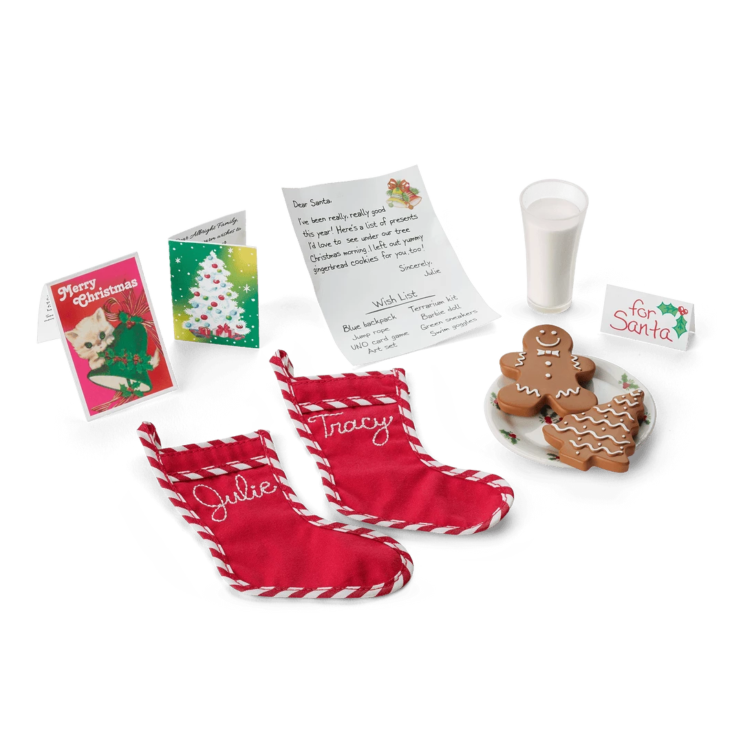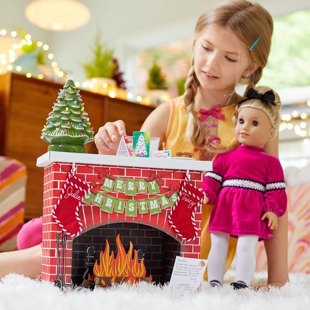 Julie’s™ Christmas Fireplace: A traditional cardboard fireplace, a light-up ceramic Christmas tree, stockings, treats for Santa, and Christmas cards.