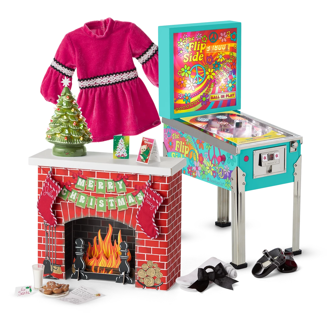 Girls can enjoy hours of imaginative fun with Julie—dressing her up and decorating for a holiday celebration, or playing a round of classic 1970s-style pinball. This set features: