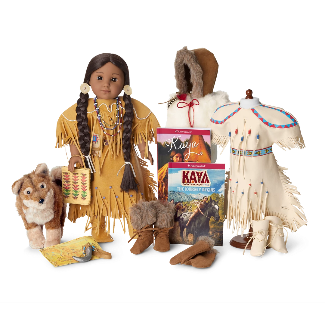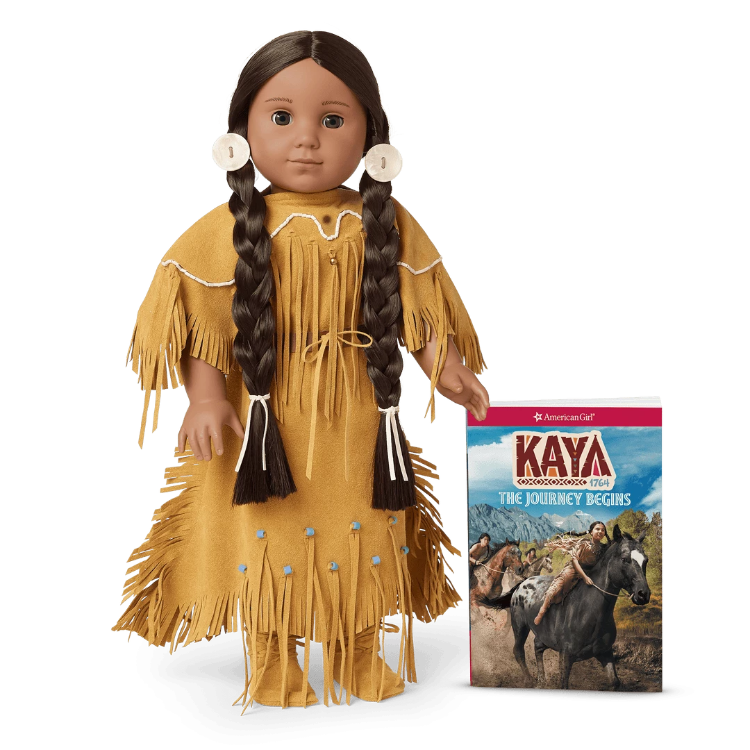 Kaya™ Doll & Book: The 18” Kaya doll has lifelike deep-brown eyes that open and close smoothly, and realistic long, shiny black hair. She comes in a soft faux-deerskin dress, matching moccasins, and faux-leather hair ties at the bottom of her braids and faux-shell hair ties at the top. Also includes The Journey Begins paperback book, the first in her series.