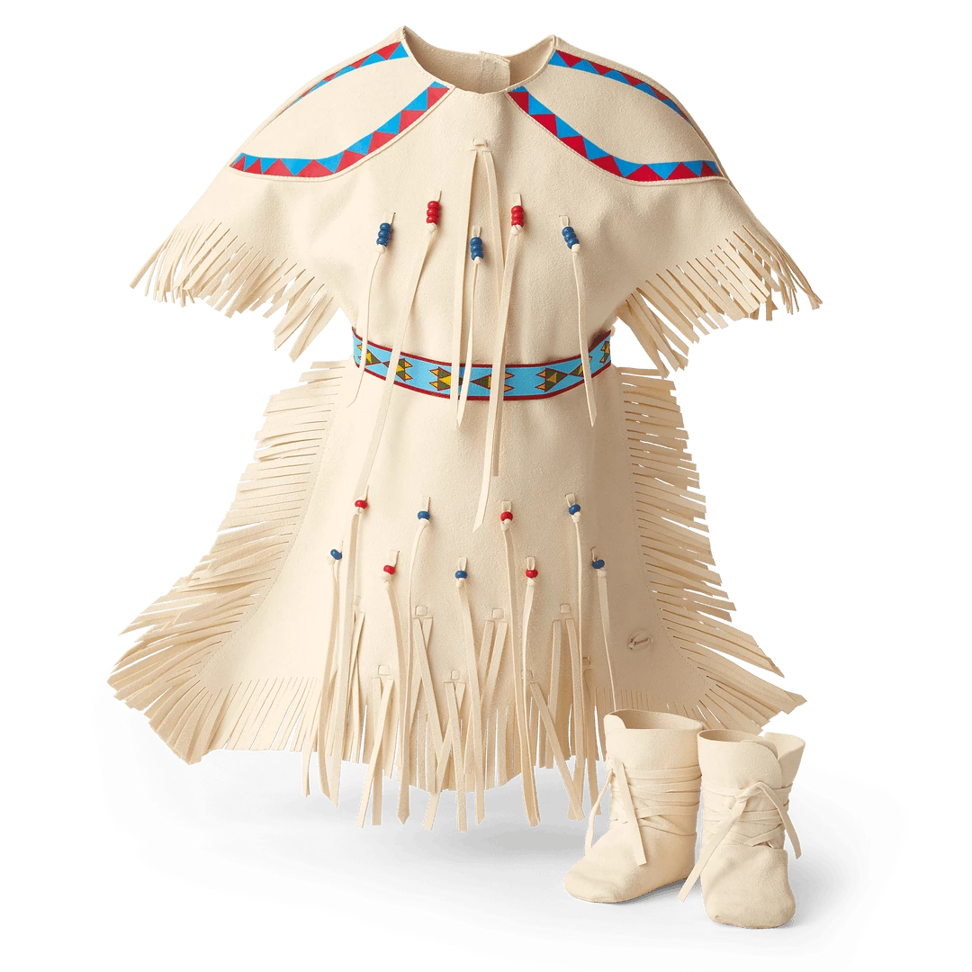 Kaya’s™ Trading Outfit: A faux-deerskin dress with a colorful belt and a pair of lace-up moccasins
