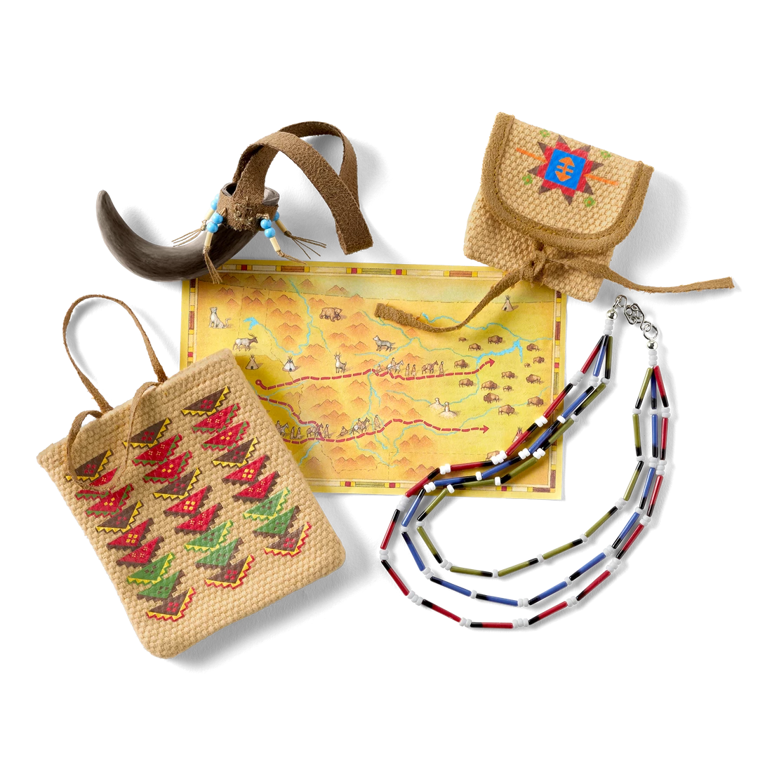 Kaya’s™ Accessories: A cornhusk bag, a belt pouch, a faux-porcupine-quill necklace, a faux-bison horn cup, and a bison-hunt illustration