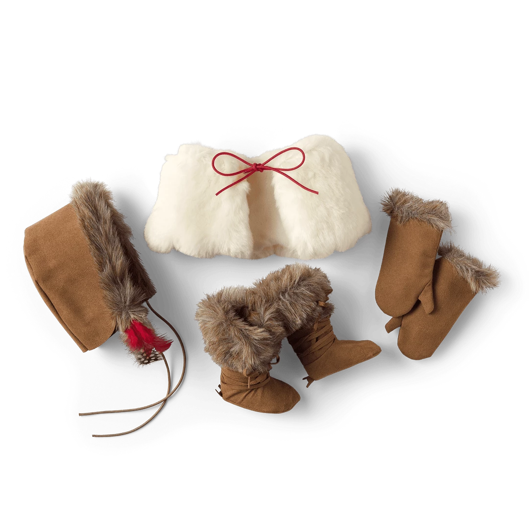 Kaya’s™ Winter Accessories: A cape of faux rabbit hides sewn together, faux-fur-trimmed moccasins and mittens, and a hood with real feathers and faux-fur trim