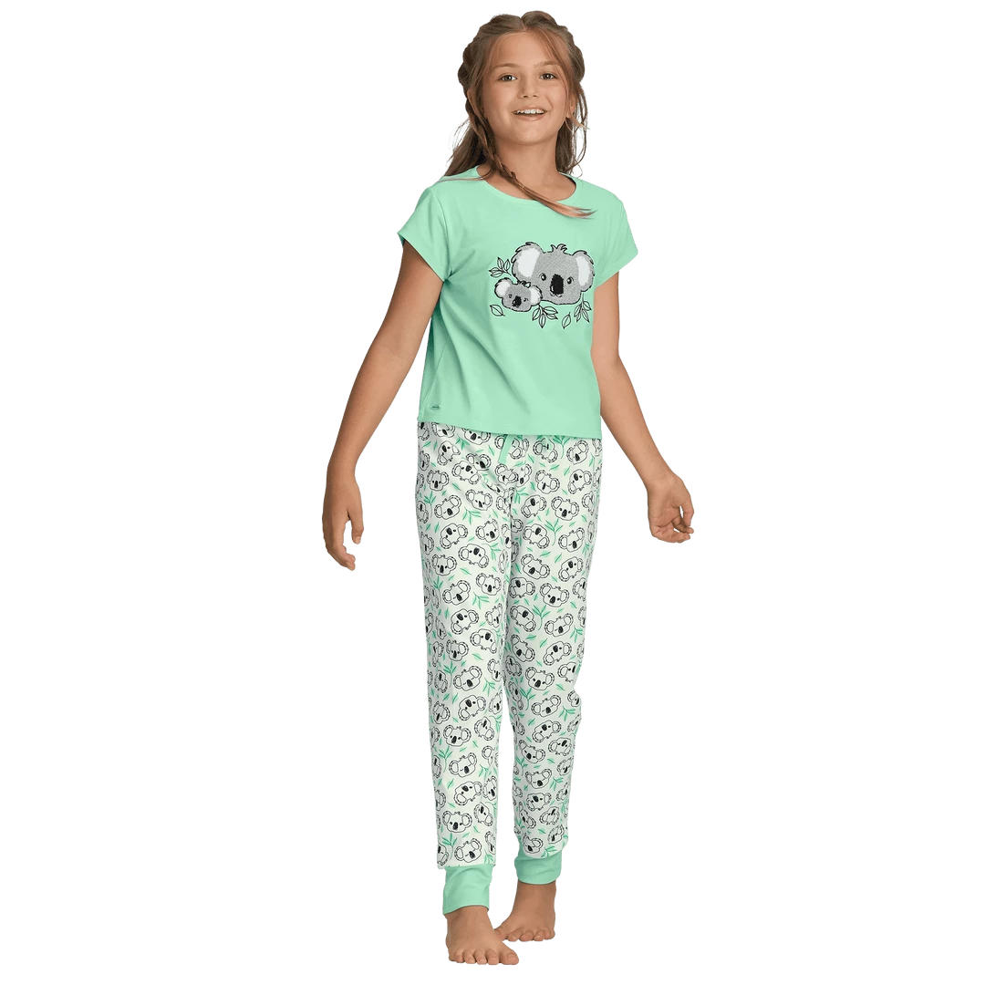 Just like Kira’s PJs! The short-sleeved pajama top has a fuzzy koala graphic on the front. PJs also include comfy jogger-style pants with ribbed cuffs, an elastic waist, and an allover koala print. Flame-resistant polyester/spandex. Imported. Print. Sizes XS-XL