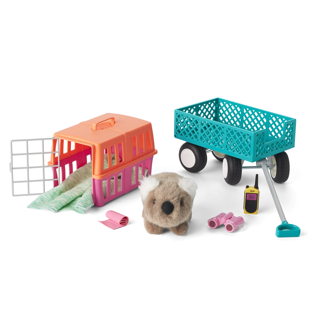 - An animal carrier that has a handle the doll can hold, and fits the wombat for transport or safekeeping