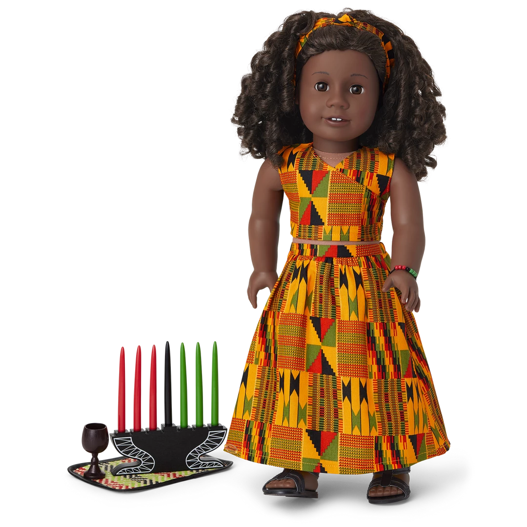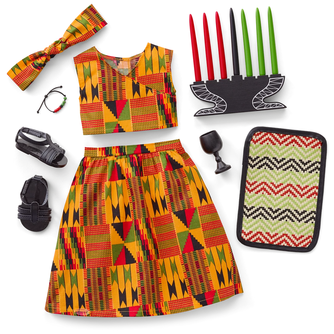 Kwanzaa is a seven-day celebration of African and African American culture, where families light a candle on the kinara (candle holder) each night and may enjoy food, song, dance, and other activities. The celebration set includes: