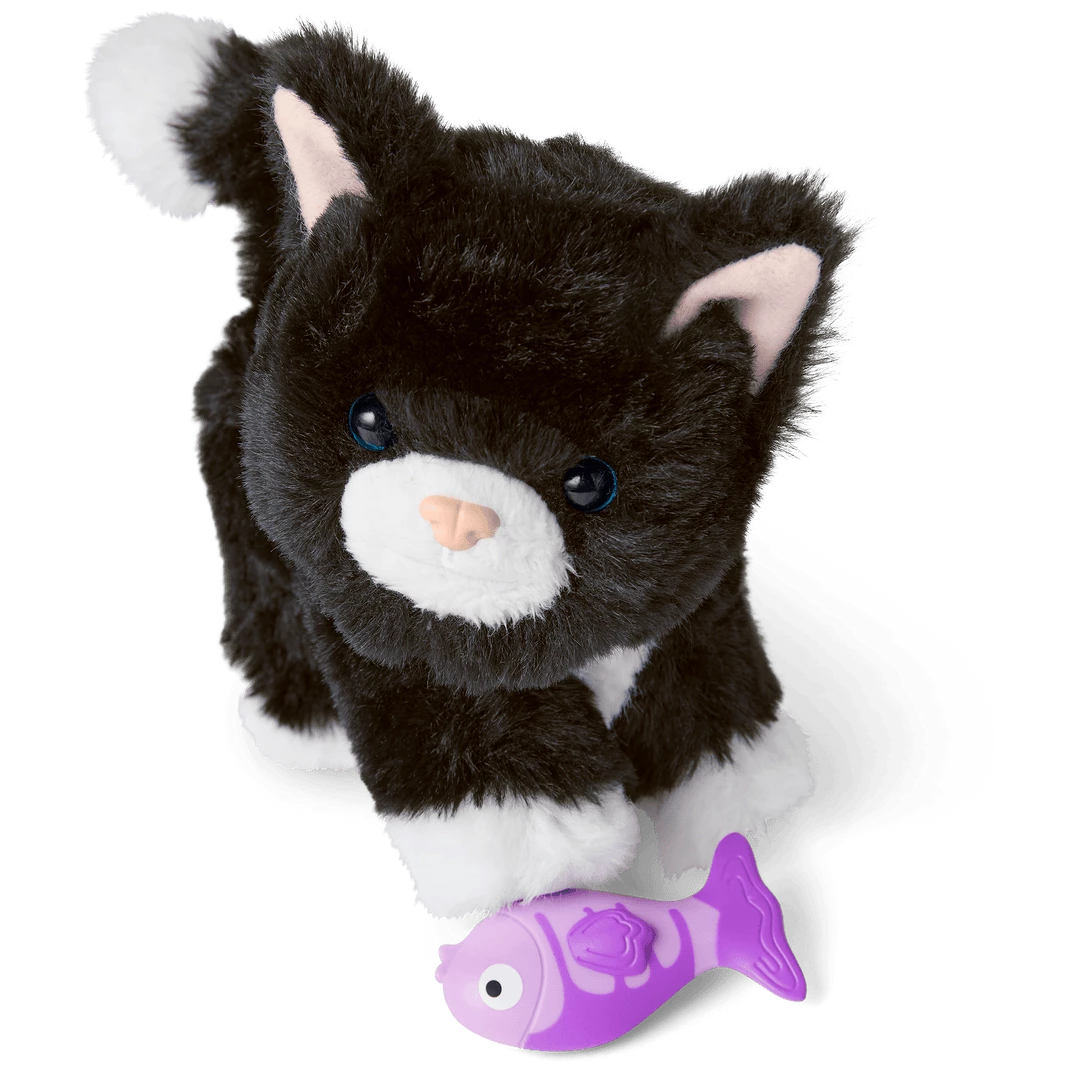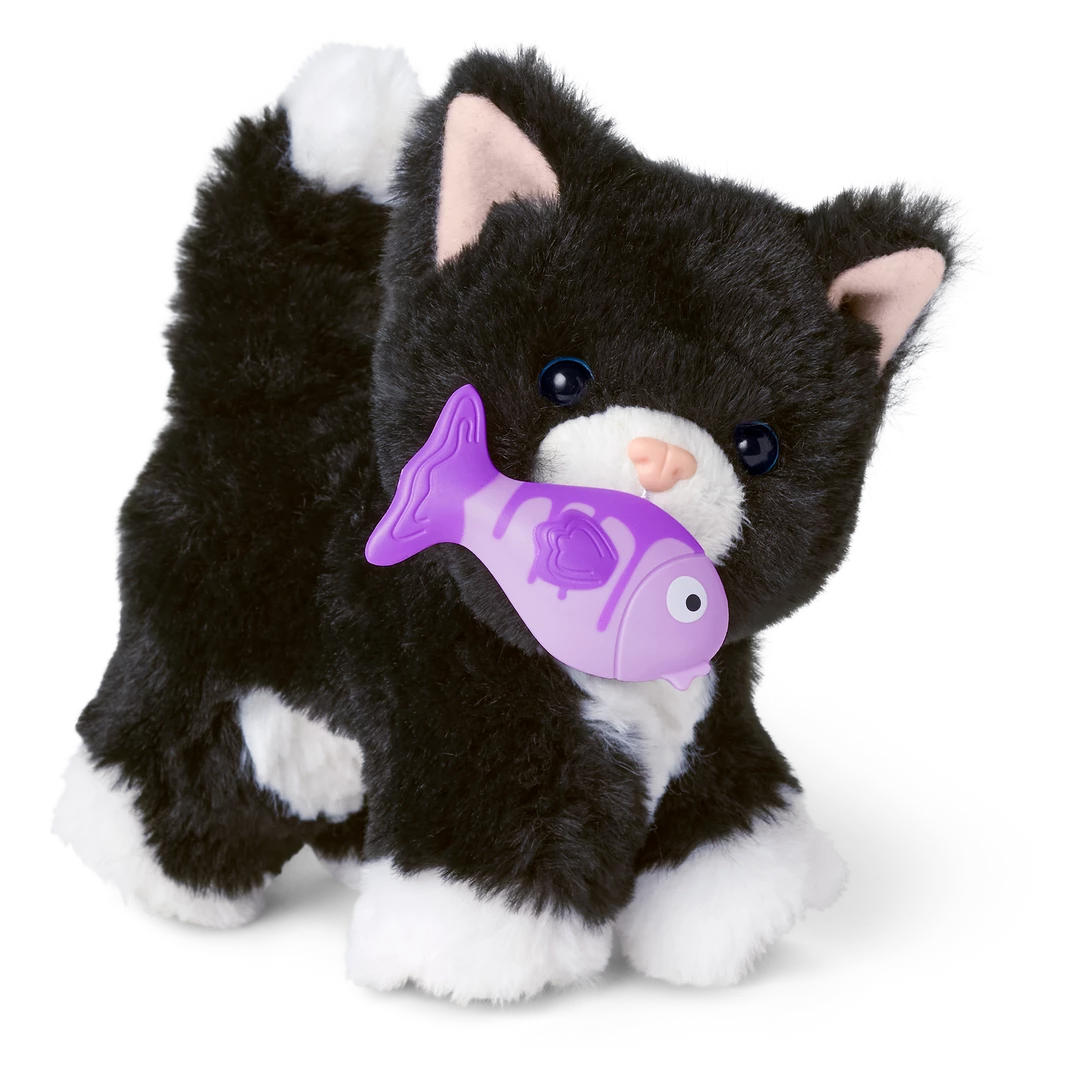 Licorice Twist™ is a curious cat who sometimes gets into mischief. This posable black-and-white cat has soft pink ears, an embroidered pink nose, and a magnetic mouth to hold her fish toy. Plus, her box can be transformed into a pet house for the perfect napping spot after a day of play!