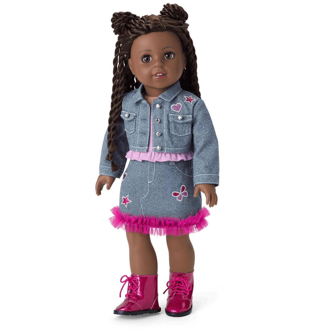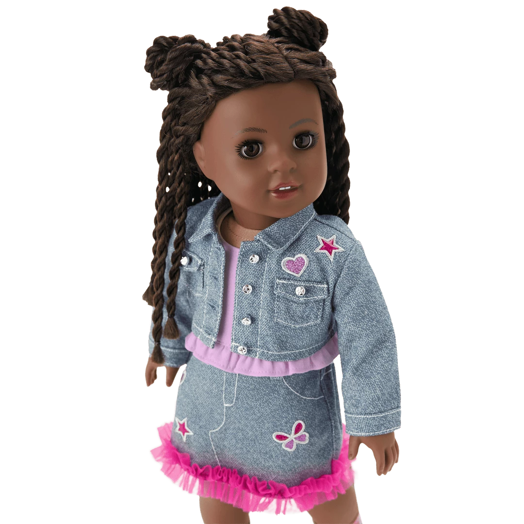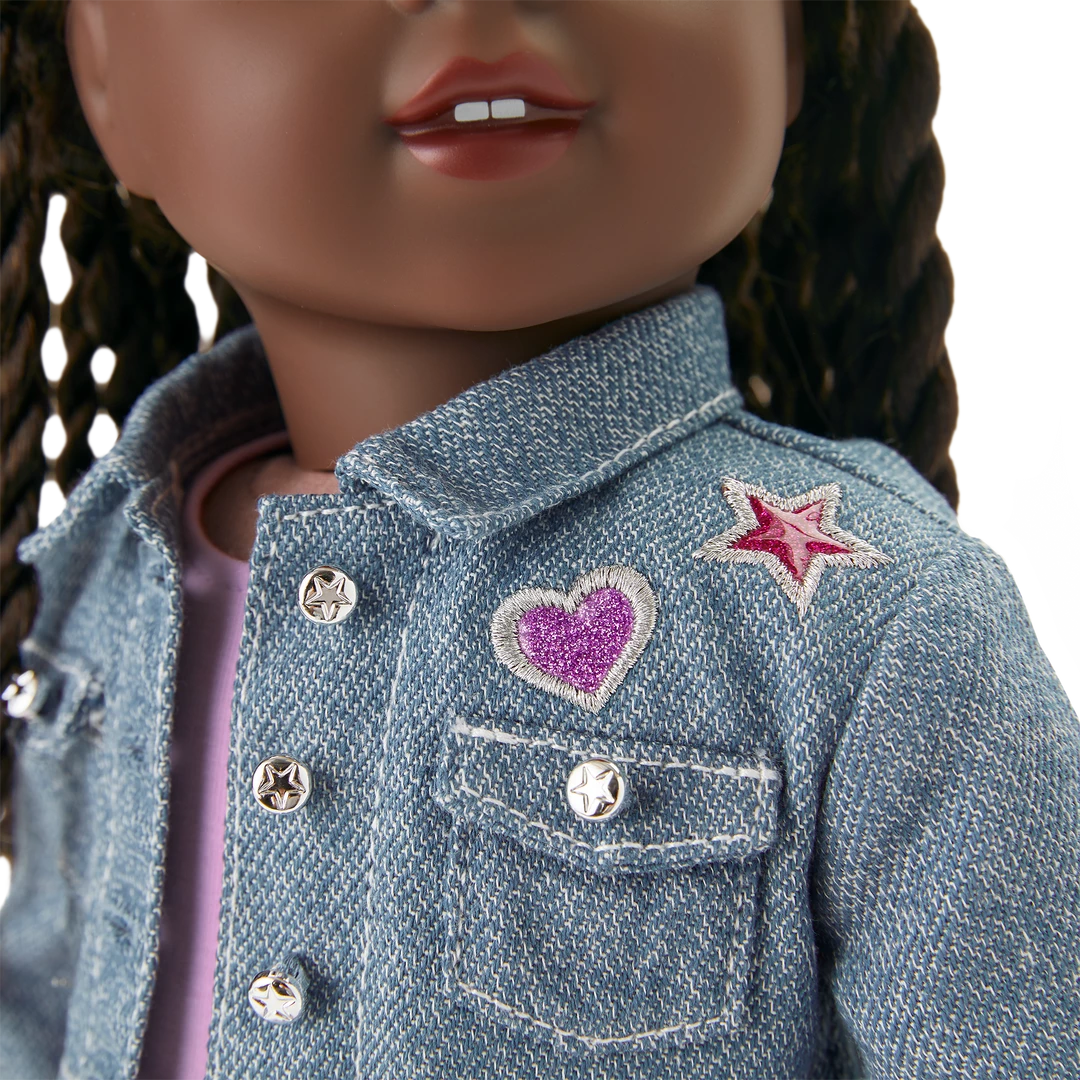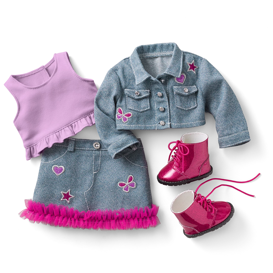- A denim jacket with front pockets, a button front, and three glitter patches—a heart, a star, and a butterfly