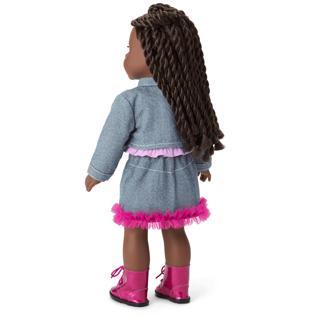 - A denim skirt with a bright pink mesh ruffle on the hem, and three multicolored glitter patches