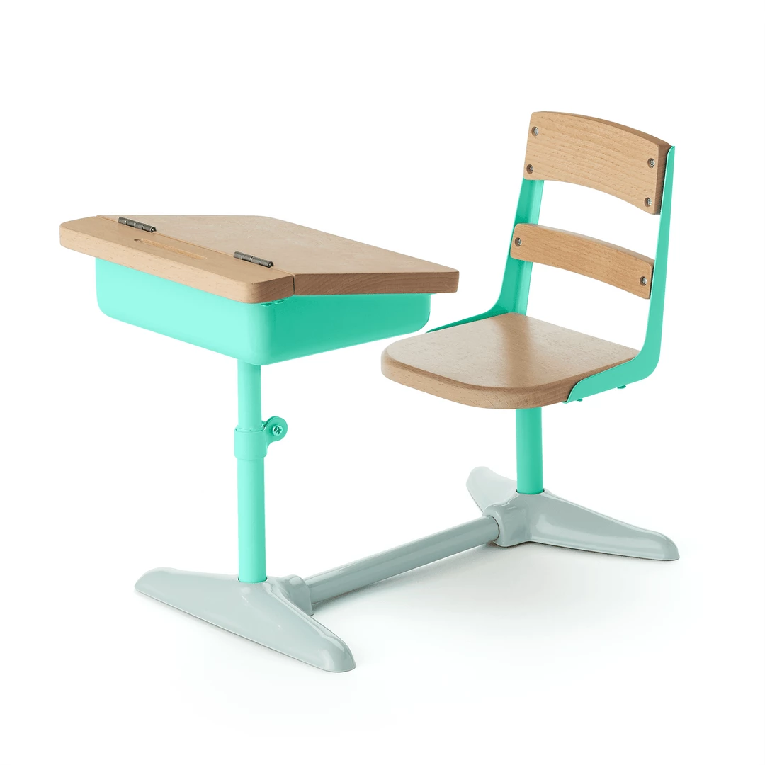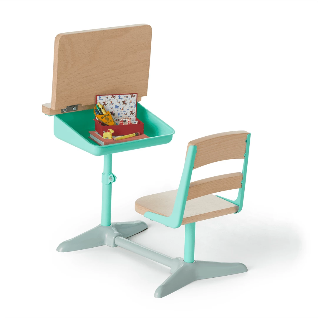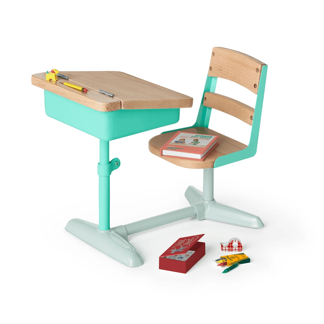 - A real wooden and metal desk, based on those found in ’50s classrooms, with a top that flips up to reveal a place to store school supplies