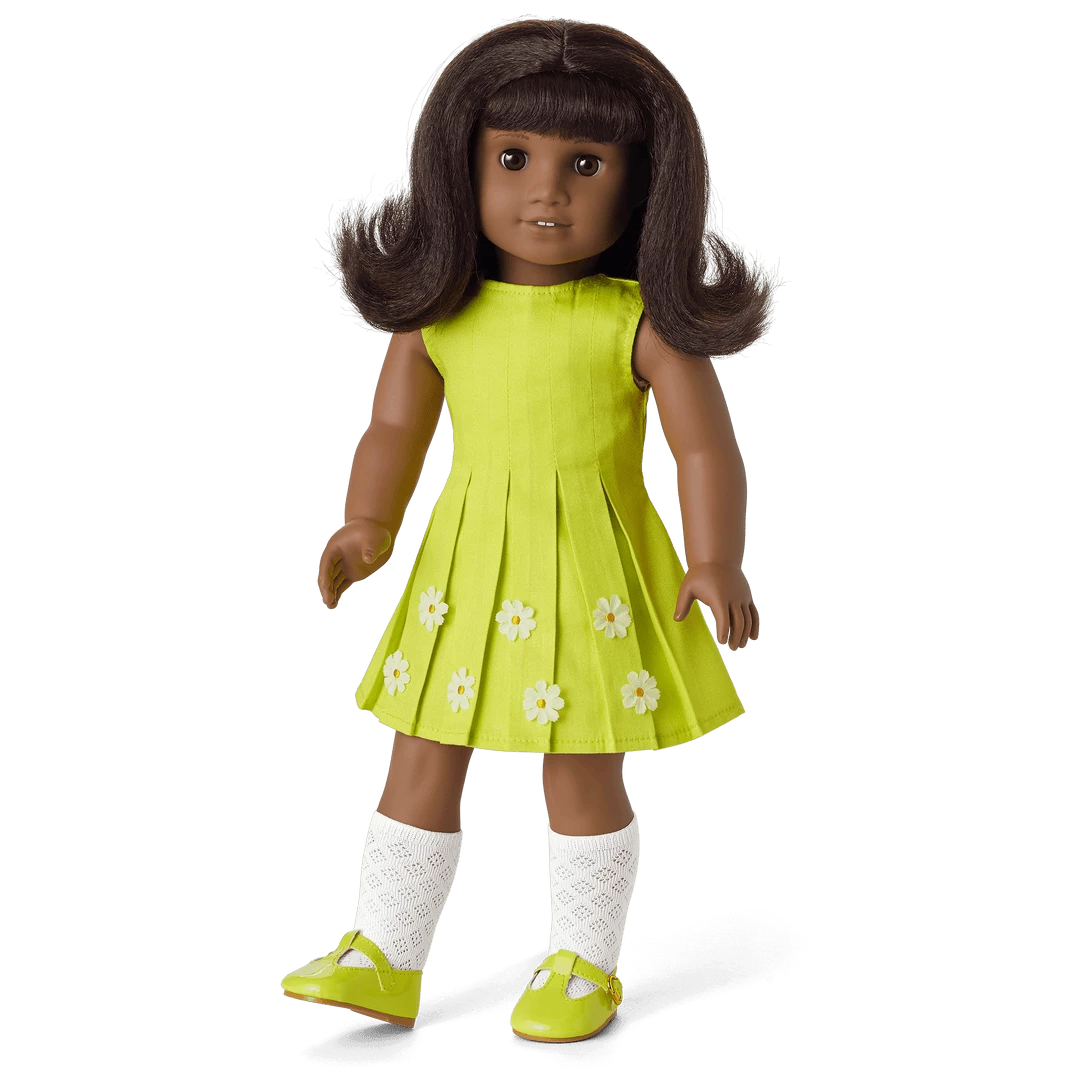 - A green dress with inverted pleats and daisy appliques on the skirt