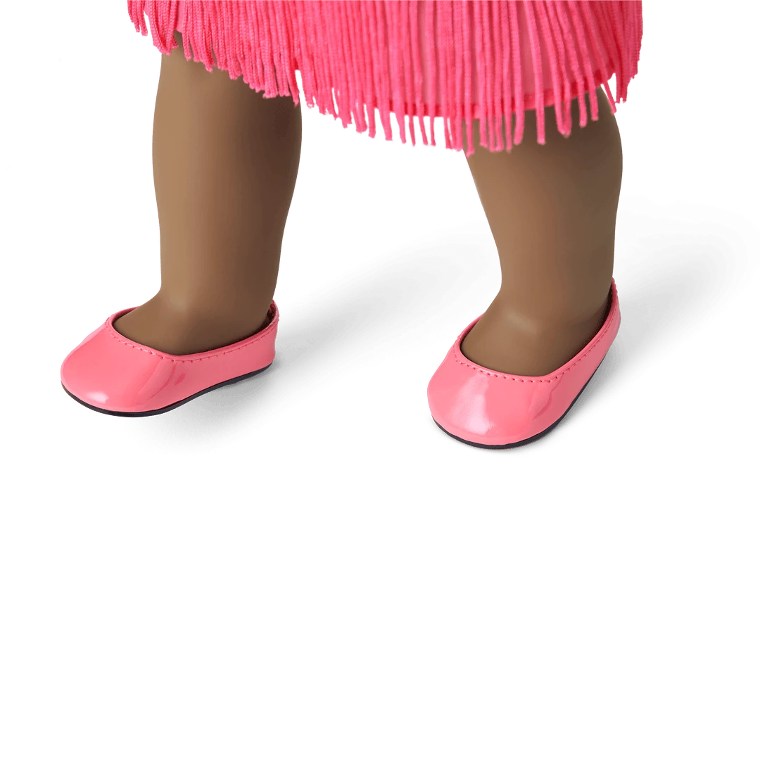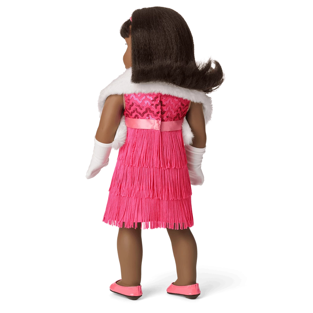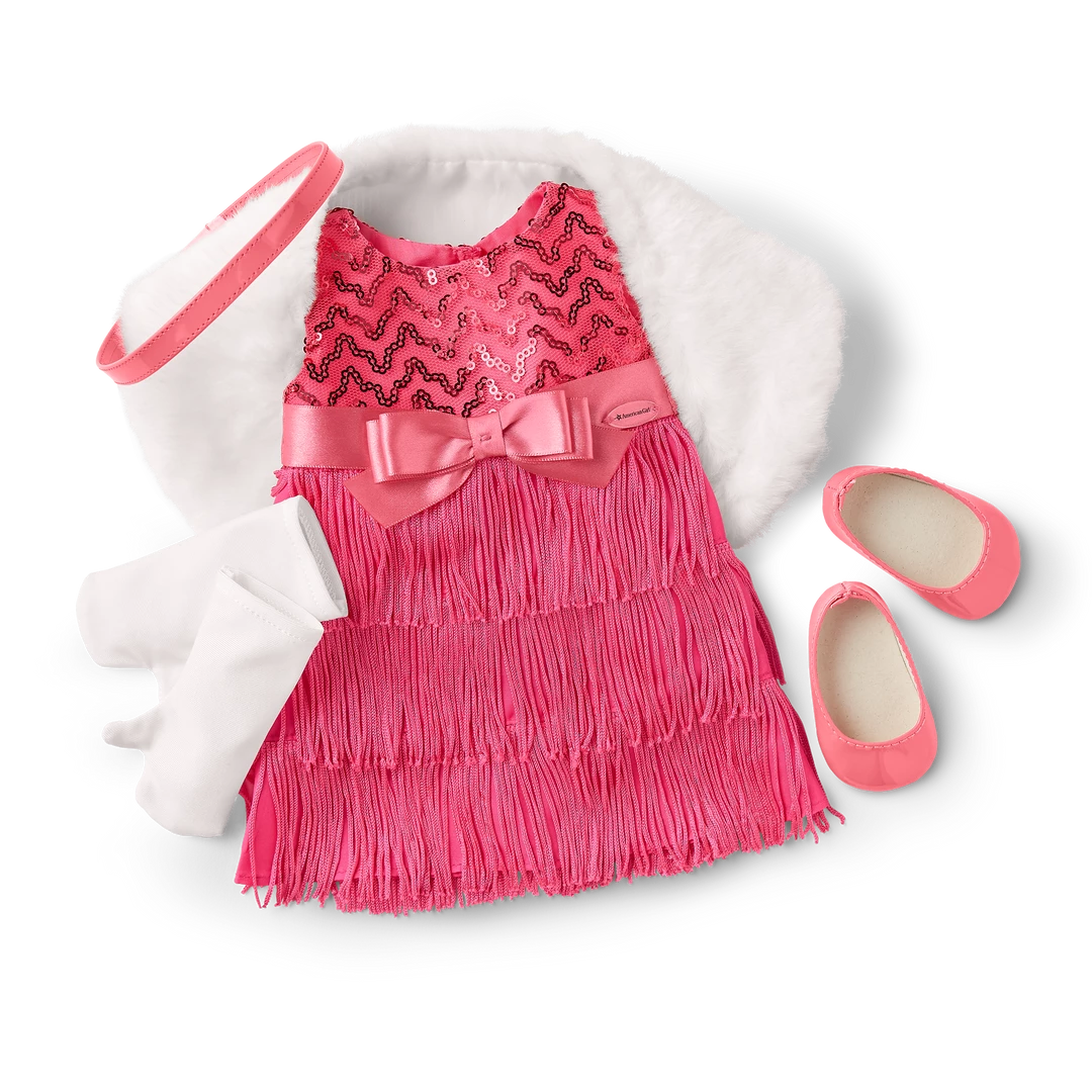 - A pink dress with a sequin bodice and three layers of fringe on the skirt that move when Melody dances