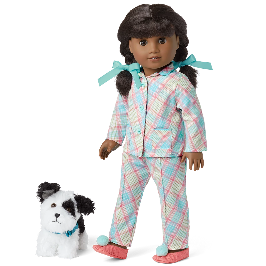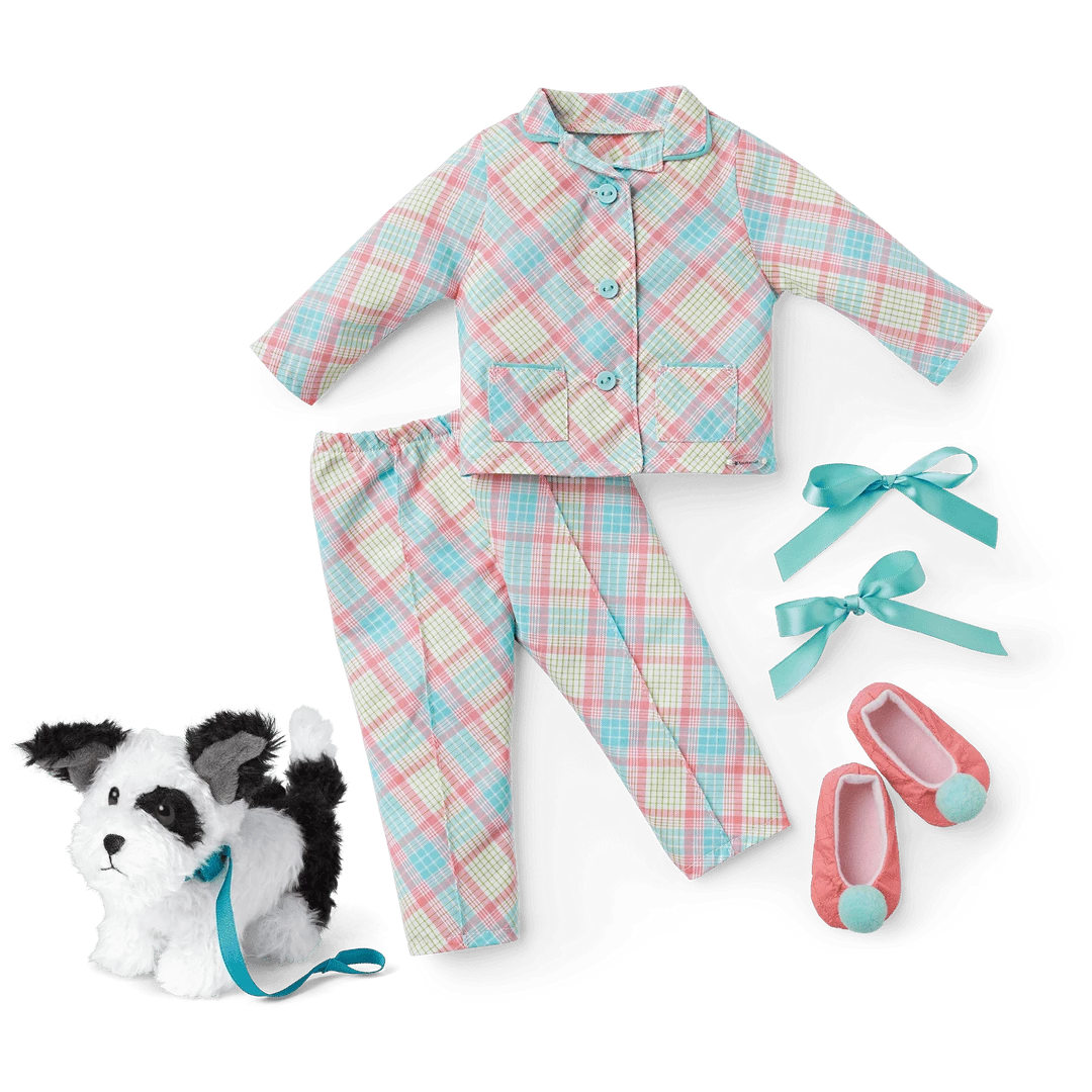 At the end of the day, your girl can tuck Melody in with a cozy pajama set and her sweet pup by her side. This set features: