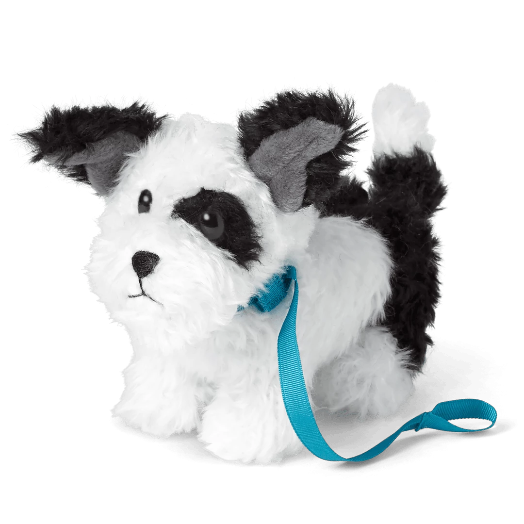 Melody’s Dog, Bo: A black-and-white dog with one bent ear, an embroidered mouth and nose, and a collar with a bow that unfolds to become a leash