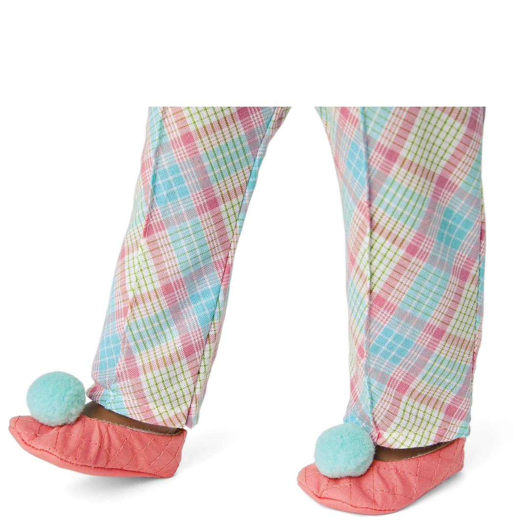 Melody’s™ Plaid Pajamas for 18-inch Dolls: A button-up PJ top with matching pants, ballet-style slippers, and a pair of hair ribbons