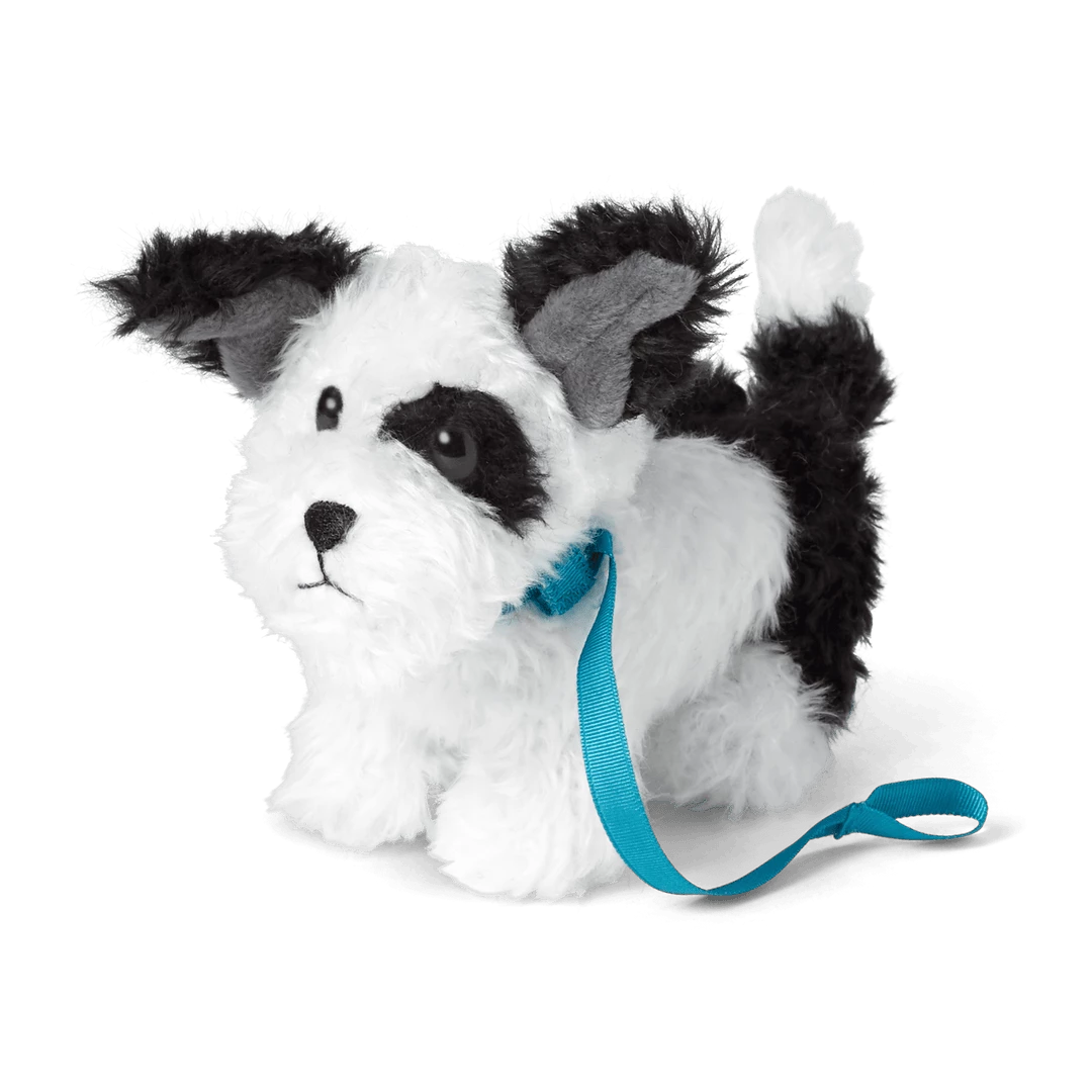 Melody’s™ Dog, Bo: A plush black-and-white dog with a blue collar and leash.