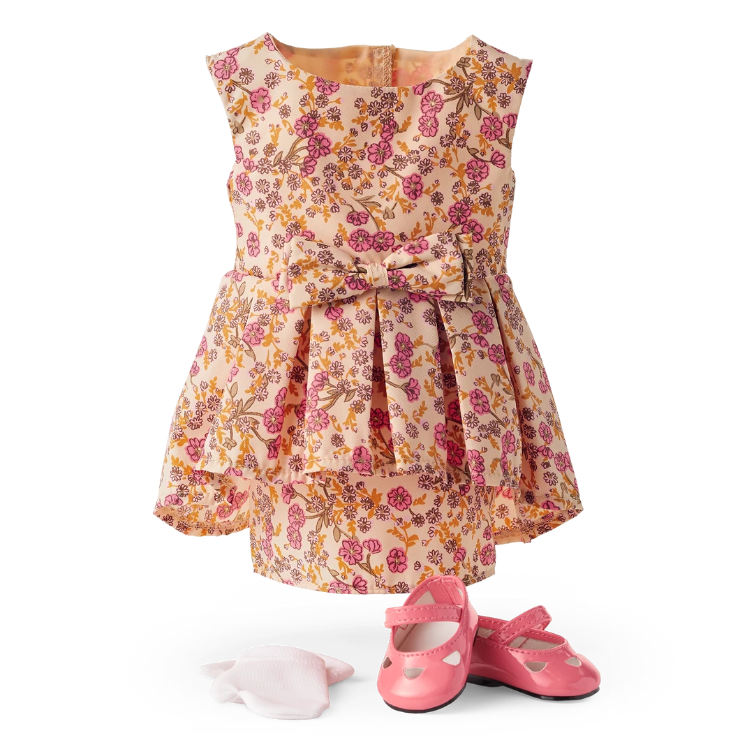 Melody’s™ Fancy Floral Dress: A floral taffeta dress, pink patent Mary Jane shoes, and a pair of white gloves.