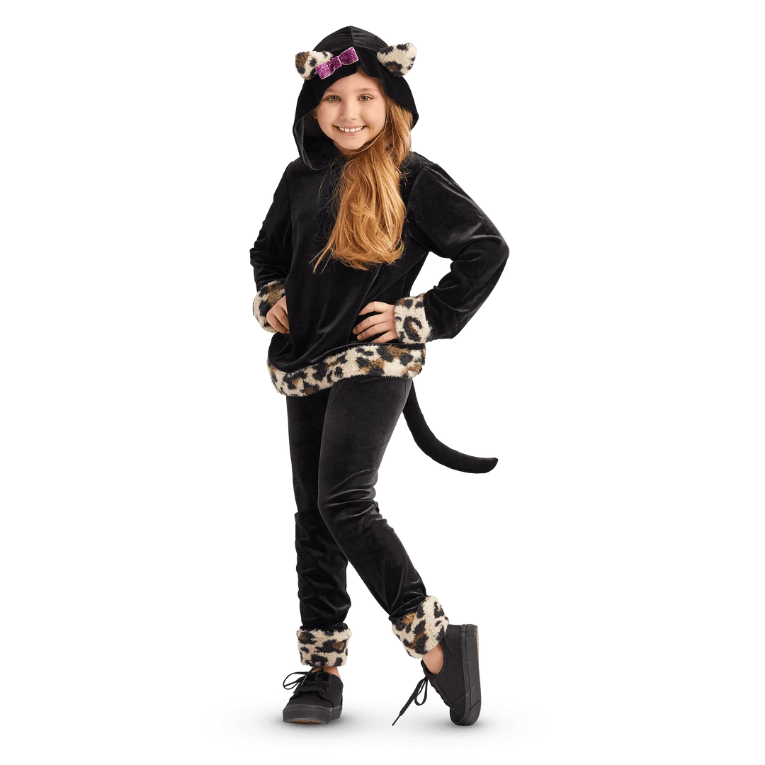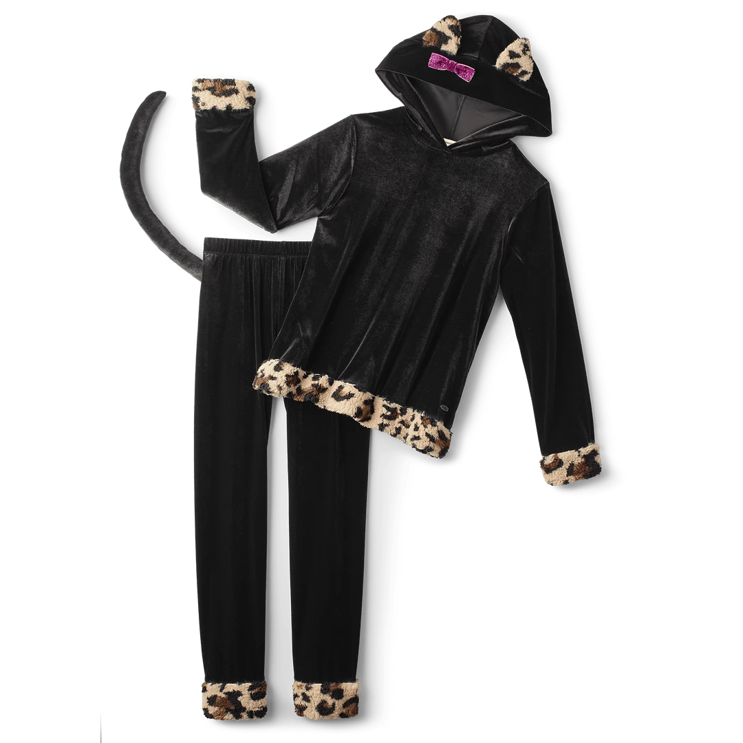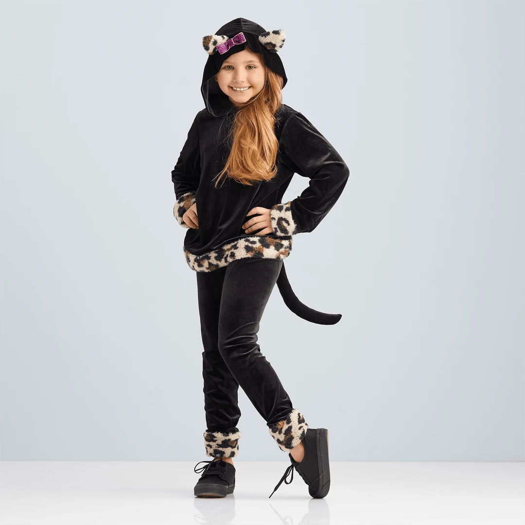 Be the cat’s meow at the next costume party—or simply lounging on the couch—in this black velour top with cheetah-print trim, cat ears and a pink glitter bow on the hood. Black velour leggings also have cheetah-print trim and a black tail that attaches to the waistband. Polyester/spandex. Imported. Black. XS-L
