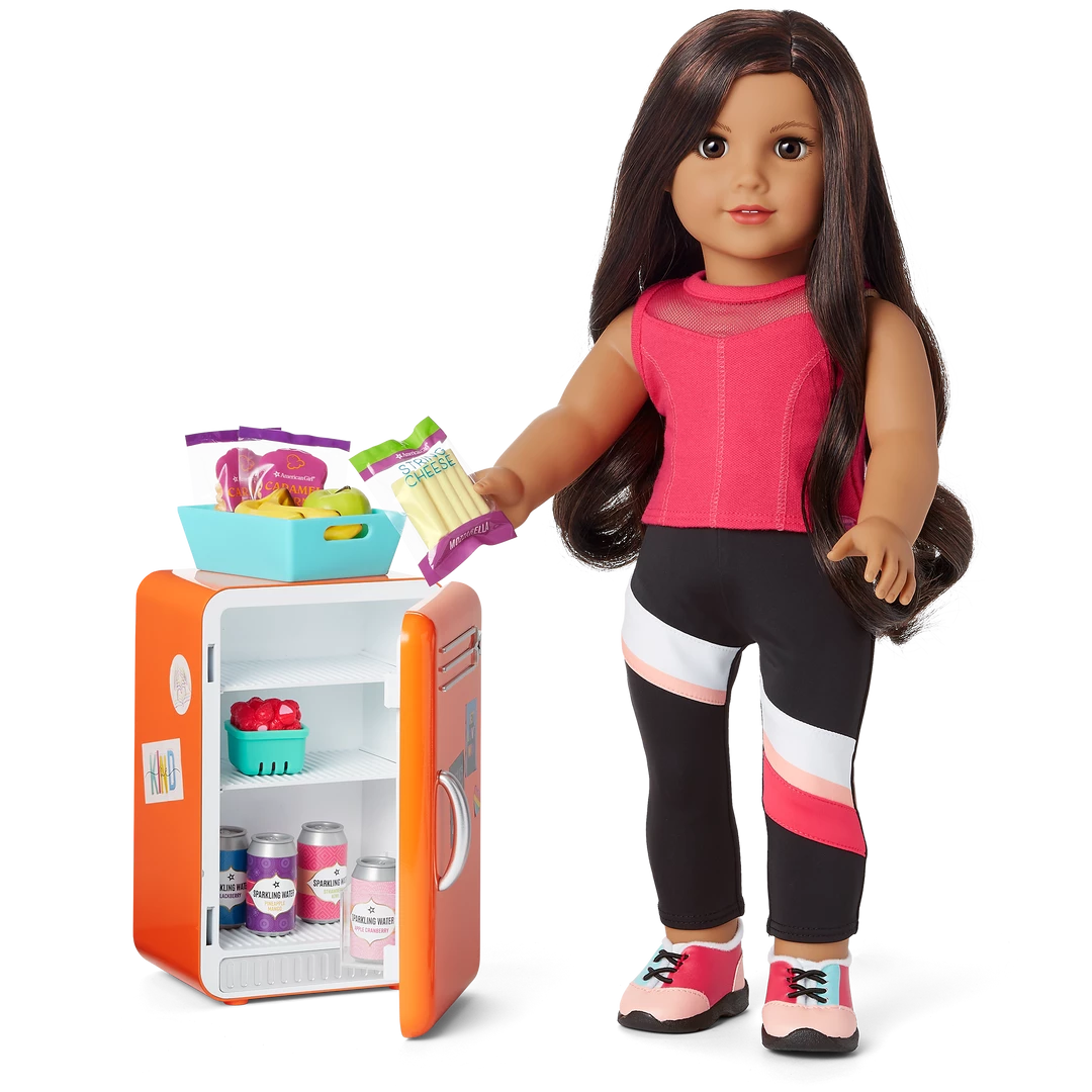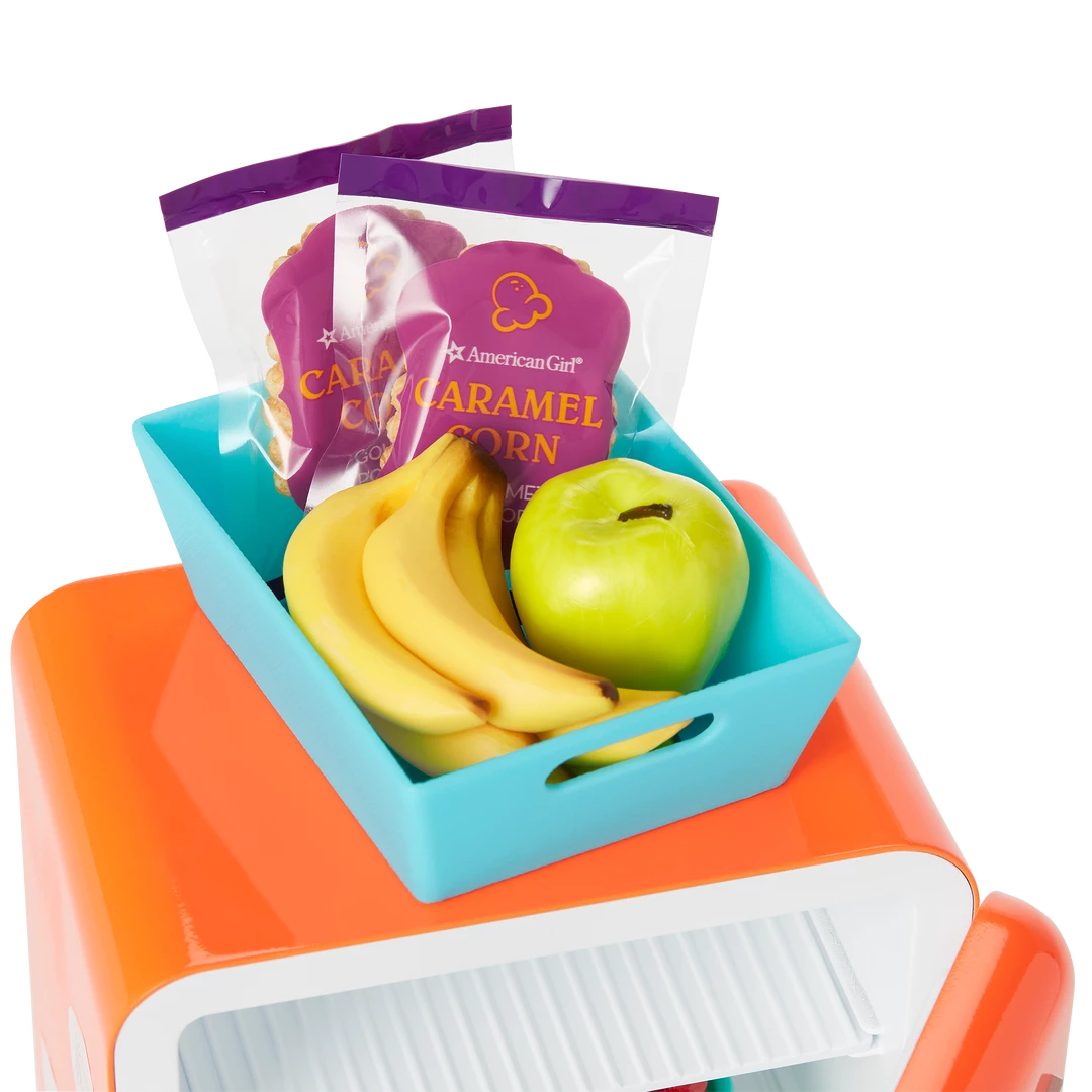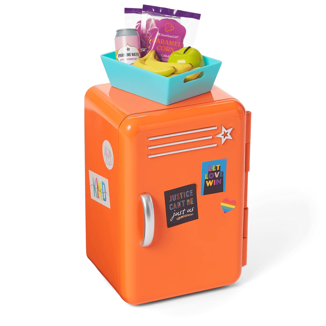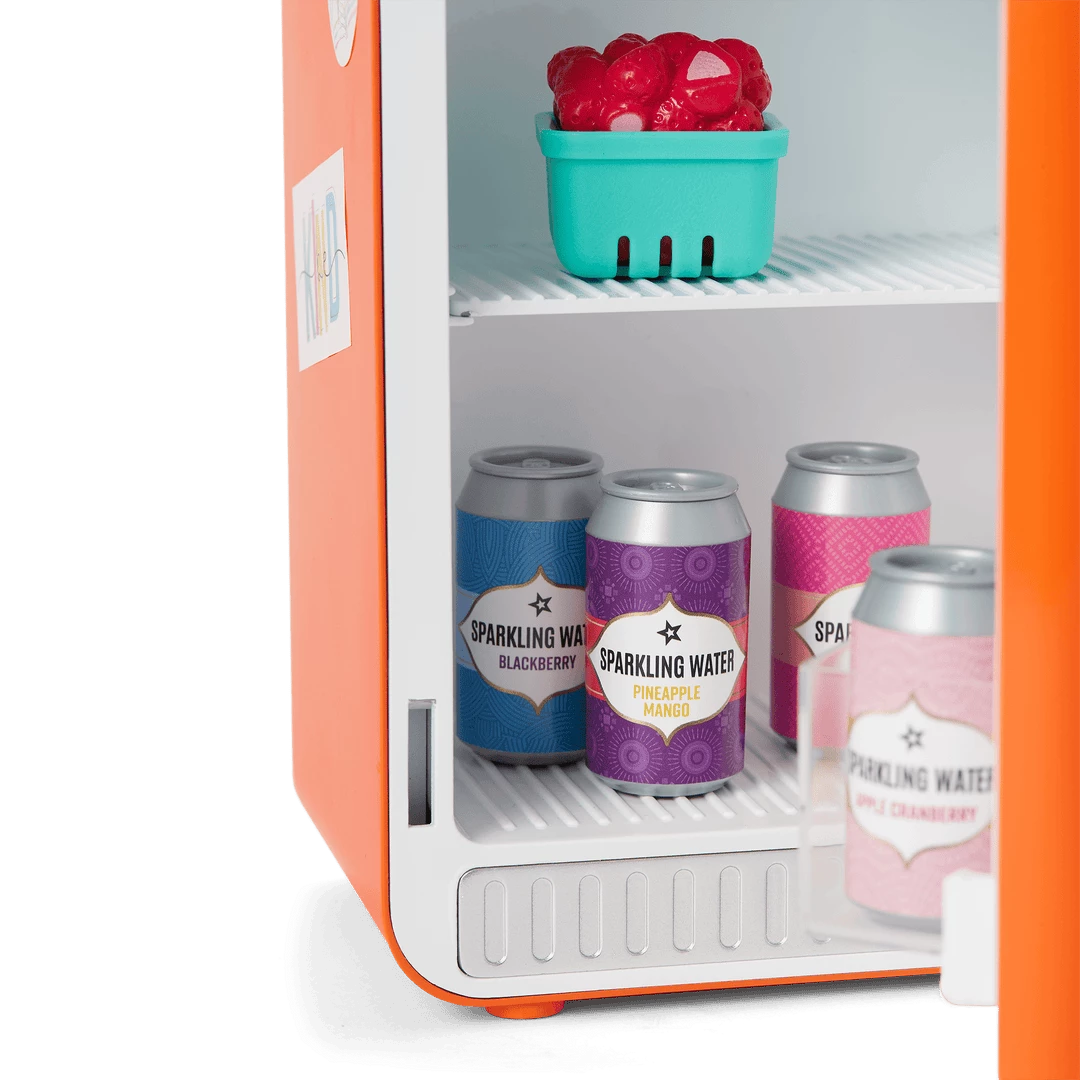 - A bright-orange mini fridge with an American Girl® star logo on the front, two interior shelves, and a shelf on the door to hold drinks