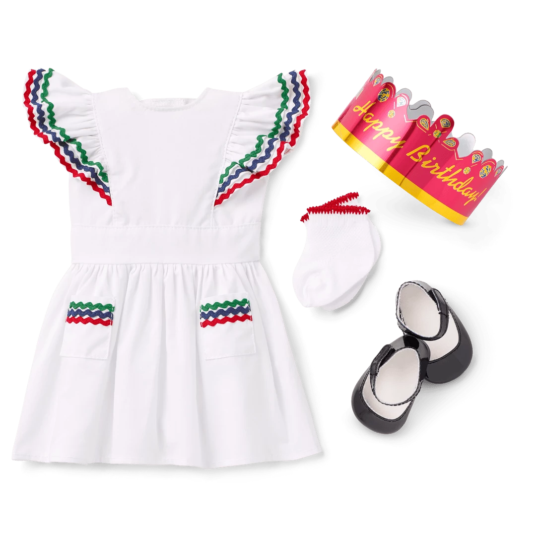 Molly’s™ Birthday Outfit for 18-inch Dolls: A white pinafore dress with three tiers of ruffles at the shoulder and rickrack trim, ankle socks, shiny black Mary Janes, and a paper birthday crown