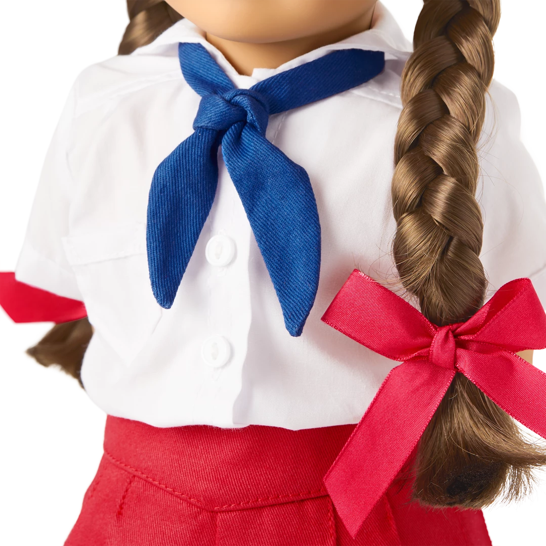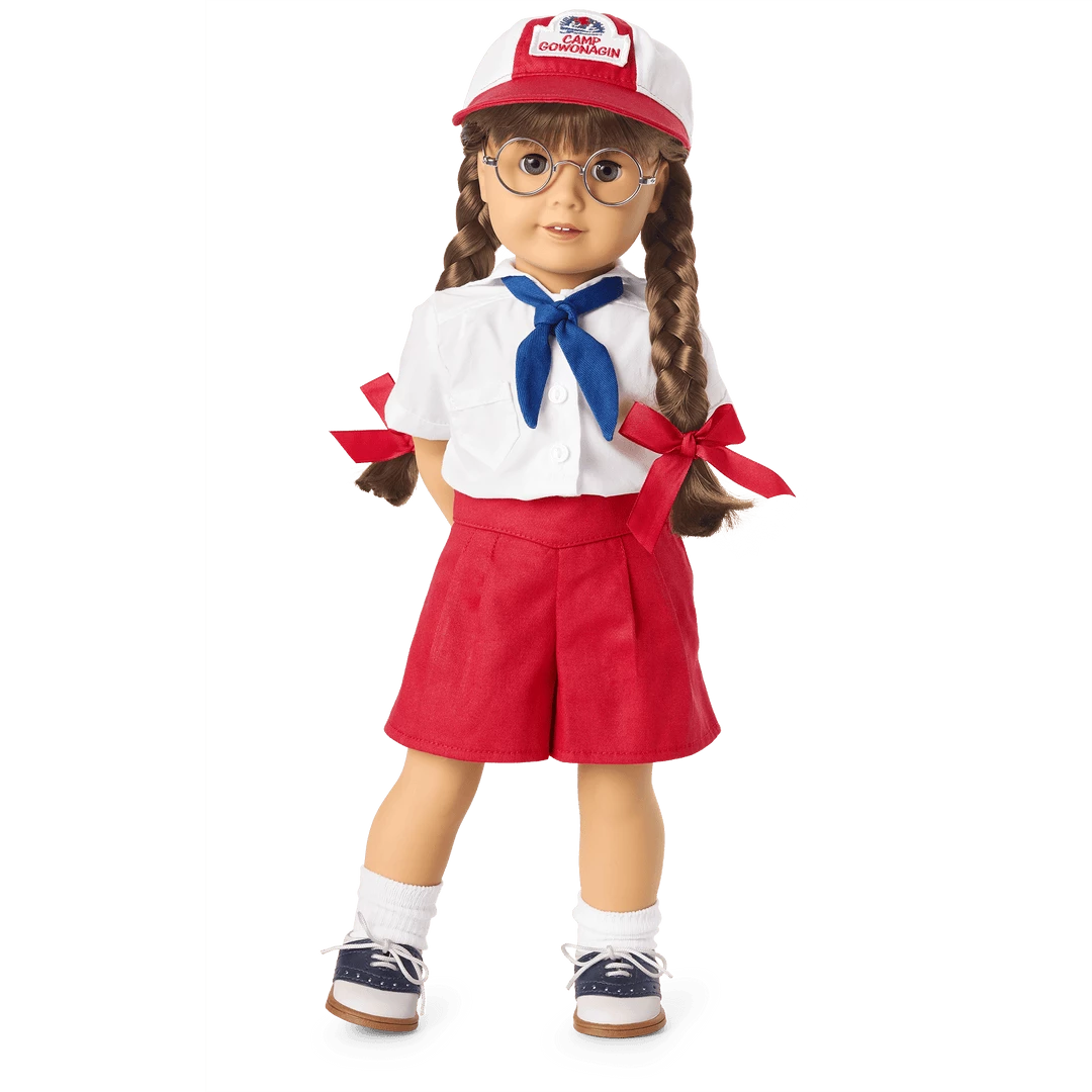 Molly’s™ Camp Gowonagin Uniform for 18-inch Dolls: A short-sleeved white button-front shirt with a collar, a blue necktie tied in a knot, a pair of high-waisted red pleated shorts, a baseball cap with a Camp Gowonagin logo patch, a pair of white ankle socks, and a pair of navy-and-white saddle shoes