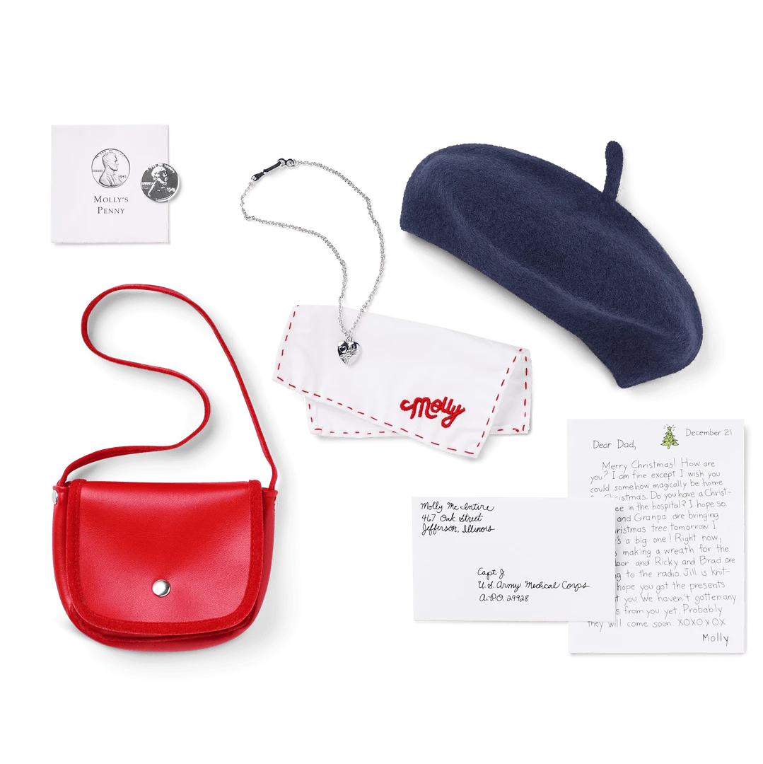 Molly’s™ Accessories: A navy blue felt beret, a shiny red purse with a shoulder strap, a white hankie with her monogram embroidered in red, a silver heart necklace with embossed detail, a reproduction 1943 steel-cut penny used during wartime copper shortages, a letter that Molly wrote to her father at Christmastime