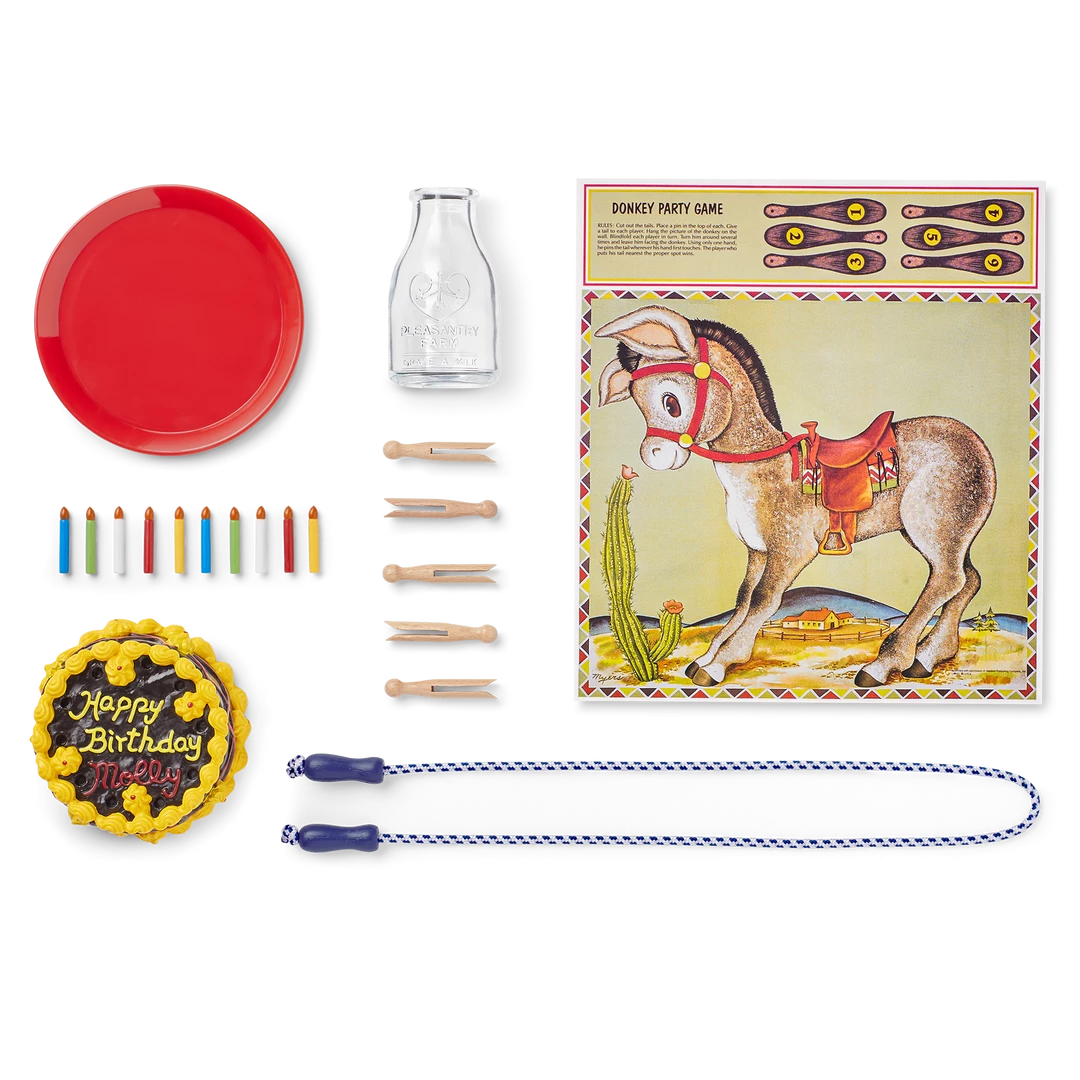 Molly’s™ Birthday Accessories for 18-inch Dolls: A chocolate birthday cake with five removable candles, a red plate, a jump rope that Molly receives as a gift, a paper Pin the Tail on the Donkey game that girls can cut out and play, a glass bottle and five clothespins for playing a popular party game from the 1940s