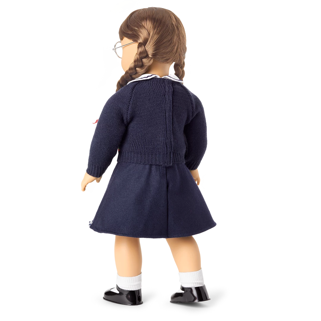 Molly™ Doll & Book: The 18” Molly doll has a huggable cloth body, gray eyes that open and close, long brown hair styled in braids, and a movable head and limbs made of smooth vinyl. Molly arrives wearing an argyle sweater with a dickey, or removable collar; a wool-blend skirt; bloomers; ankle socks; Mary Jane shoes; two red hairbows; and her signature silver metal glasses with a red felt case. She includes the Molly: A Winning Spirit paperback book.
