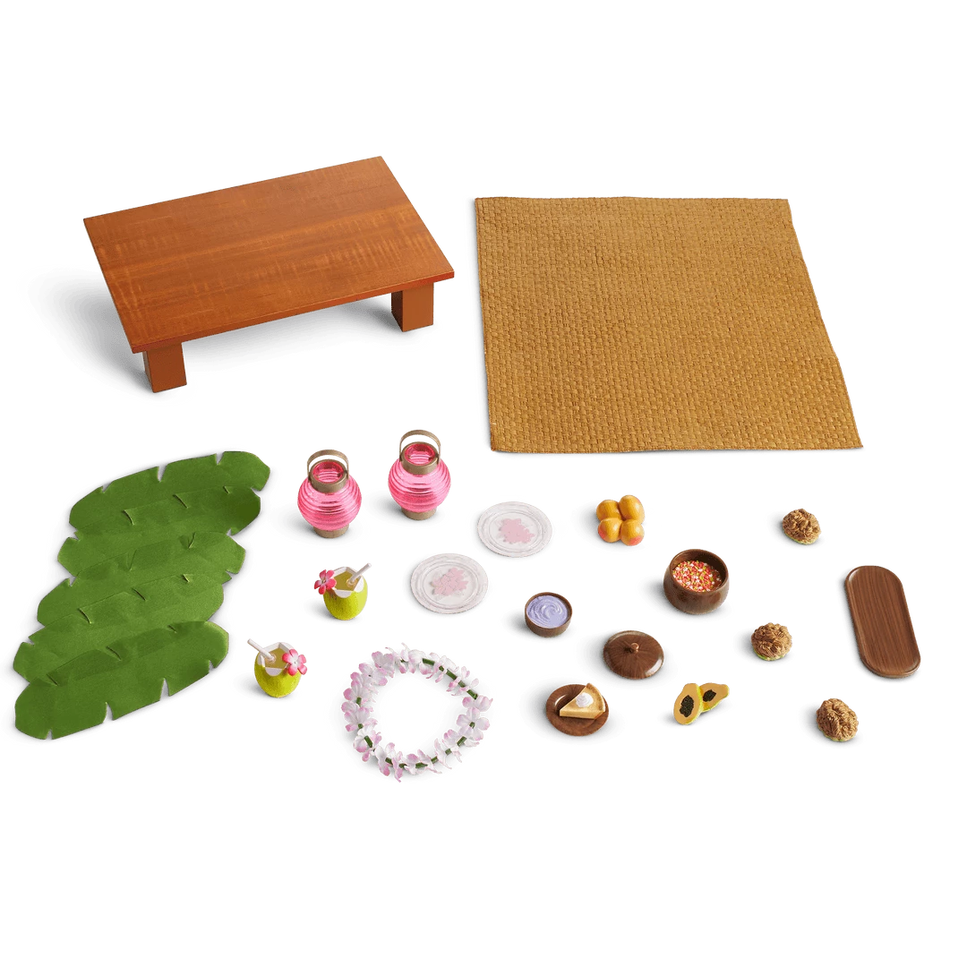 Nanea’s™ Luau Set: A low wooden table, festive pretend foods including kalua meat and a bowl of poi, table décor, and two red lanterns to hang for decorations.