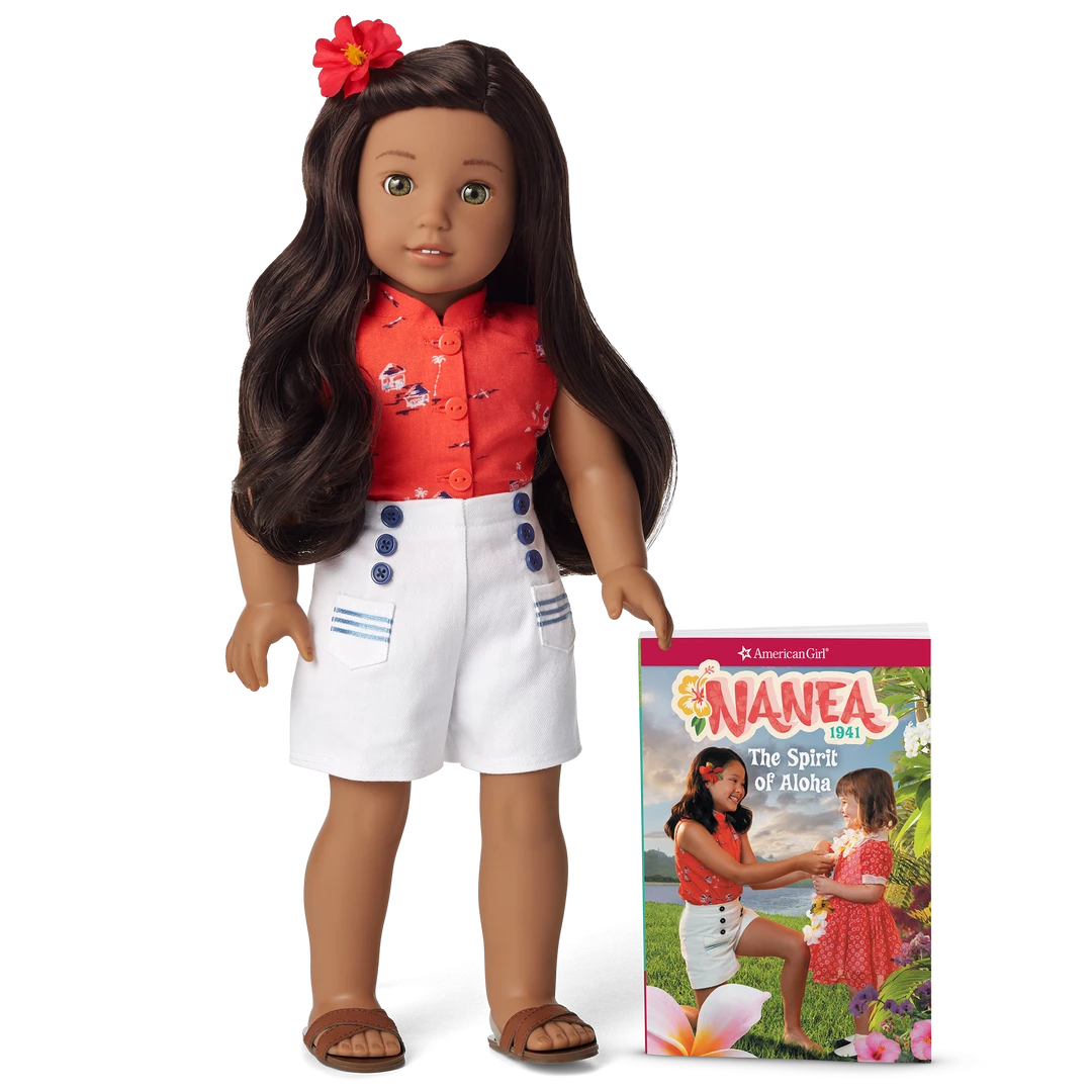 Nanea™ Doll & Book: The 18″ Nanea doll has a huggable cloth body, hazel eyes that open and close, long wavy dark-brown hair that can be styled, and a movable head and limbs made of smooth vinyl. Nanea arrives wearing a pake blouse, sailor-style moku short, a faux hibiscus flower hair clip, and a pair of shoes with crisscross straps. She includes The Spirit of Aloha paperback book.